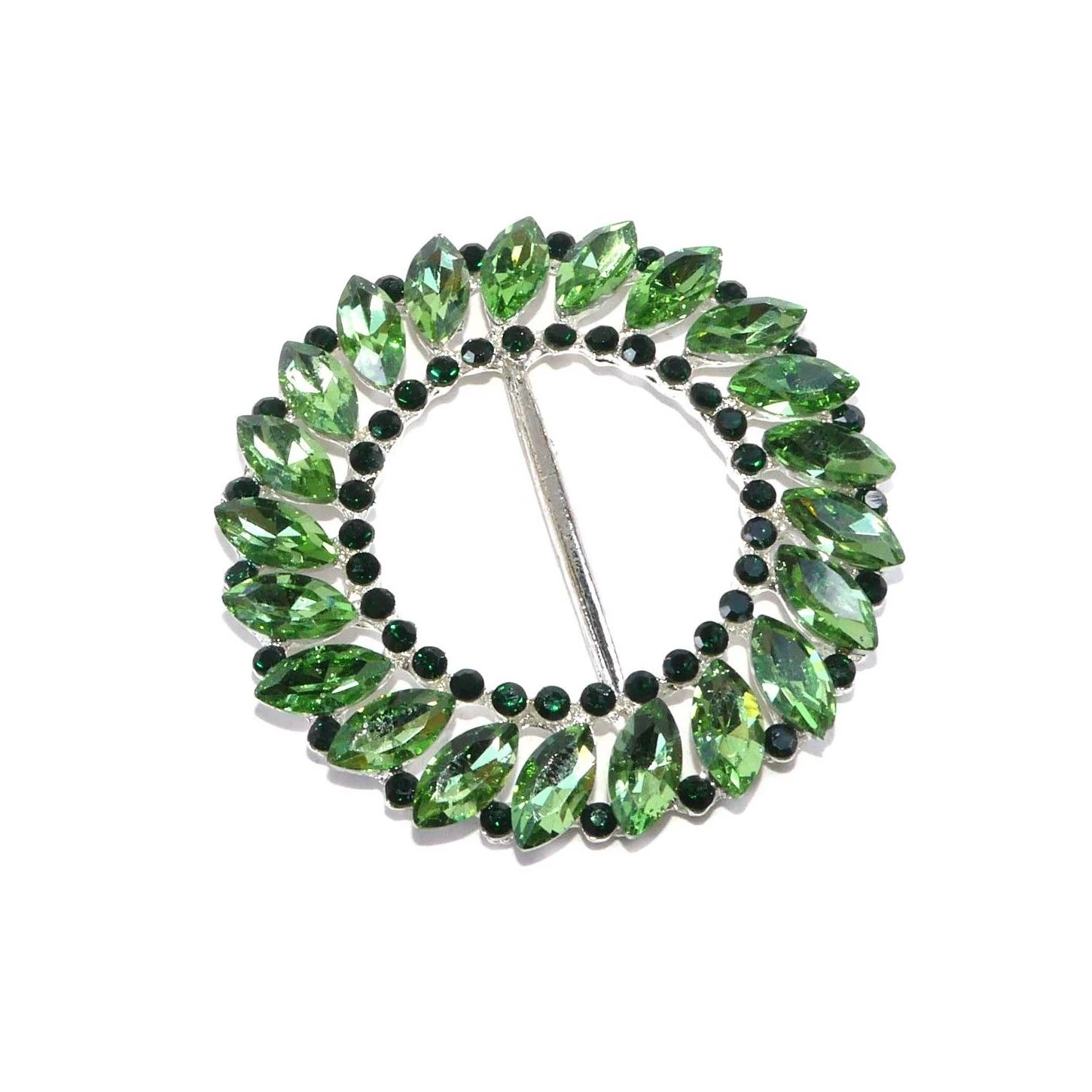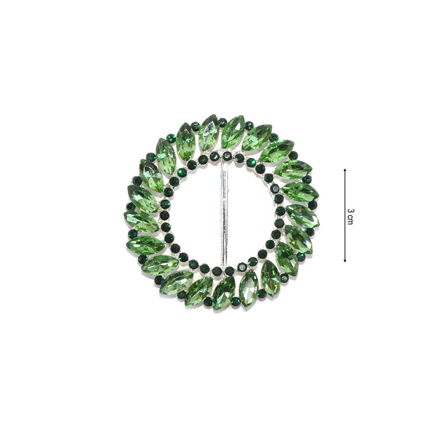 Hebilla joya de cristales en forma de aspas y strass sobre base metálica plateada y con forma redonda. Con 3cm de paso para cinta y disponible en varios colores. Seleccionar el deseado a continuación.