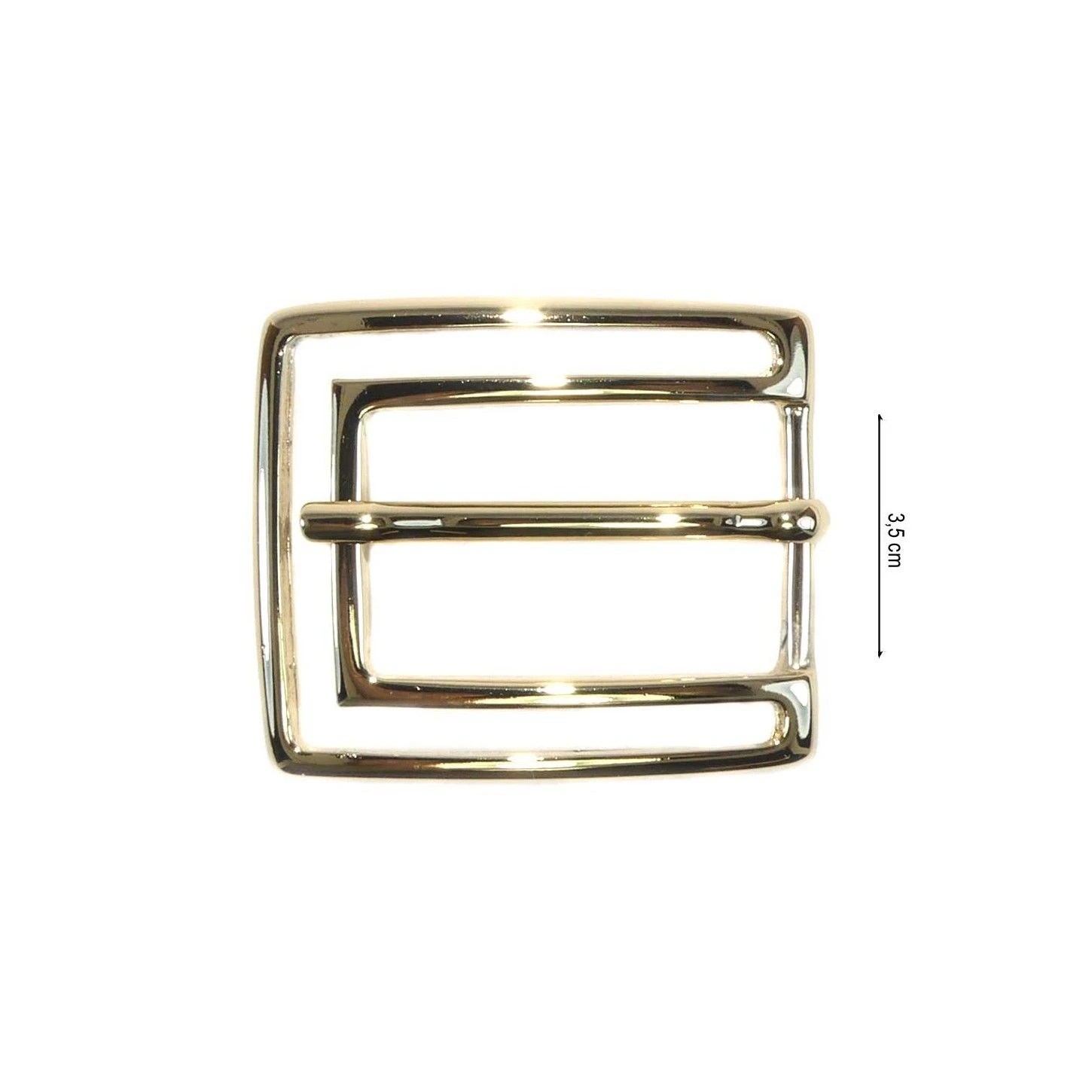 Hebilla metálica rectangular para cinturón con original diseño de doble estructura, en color oro con 3,5cm de paso para la cinta.