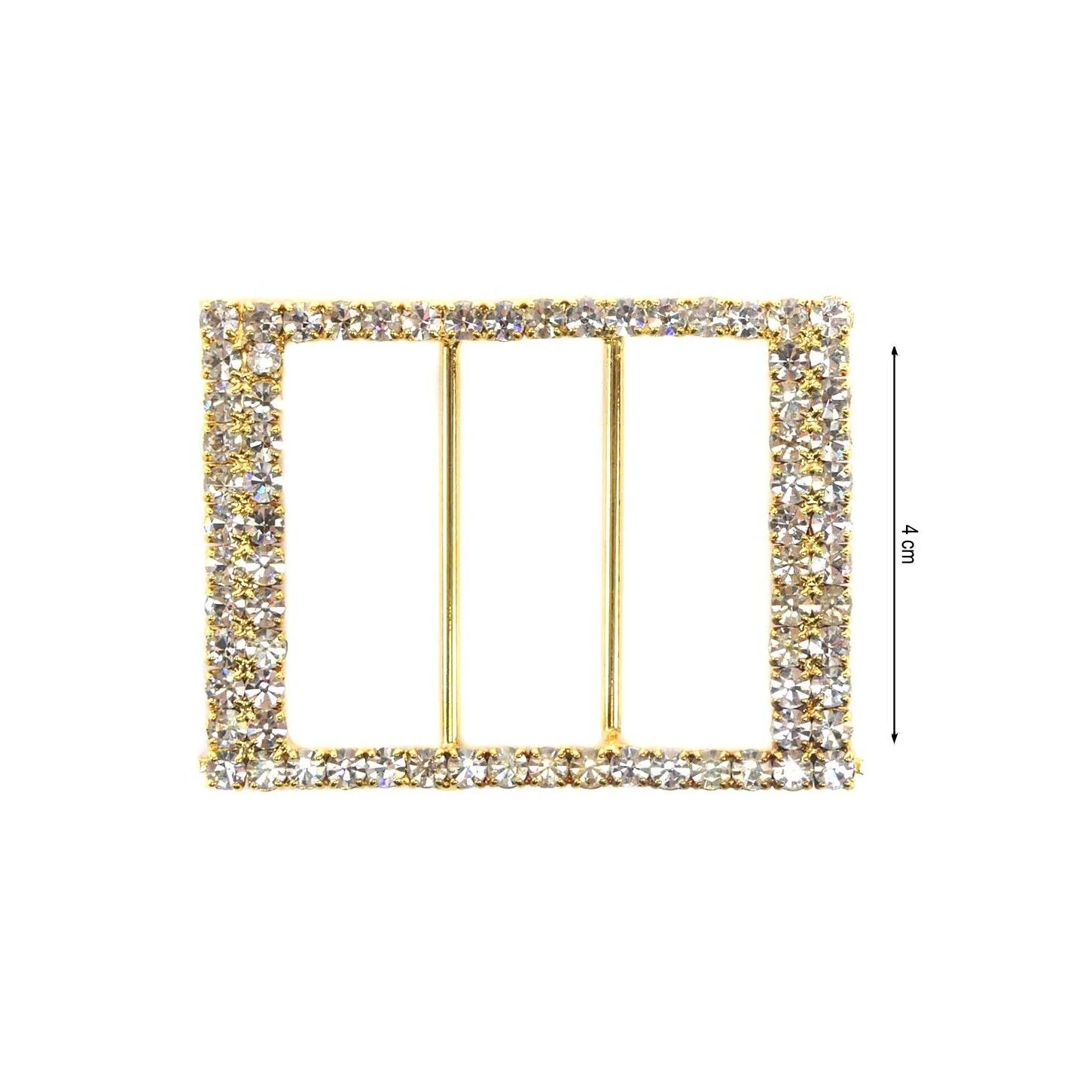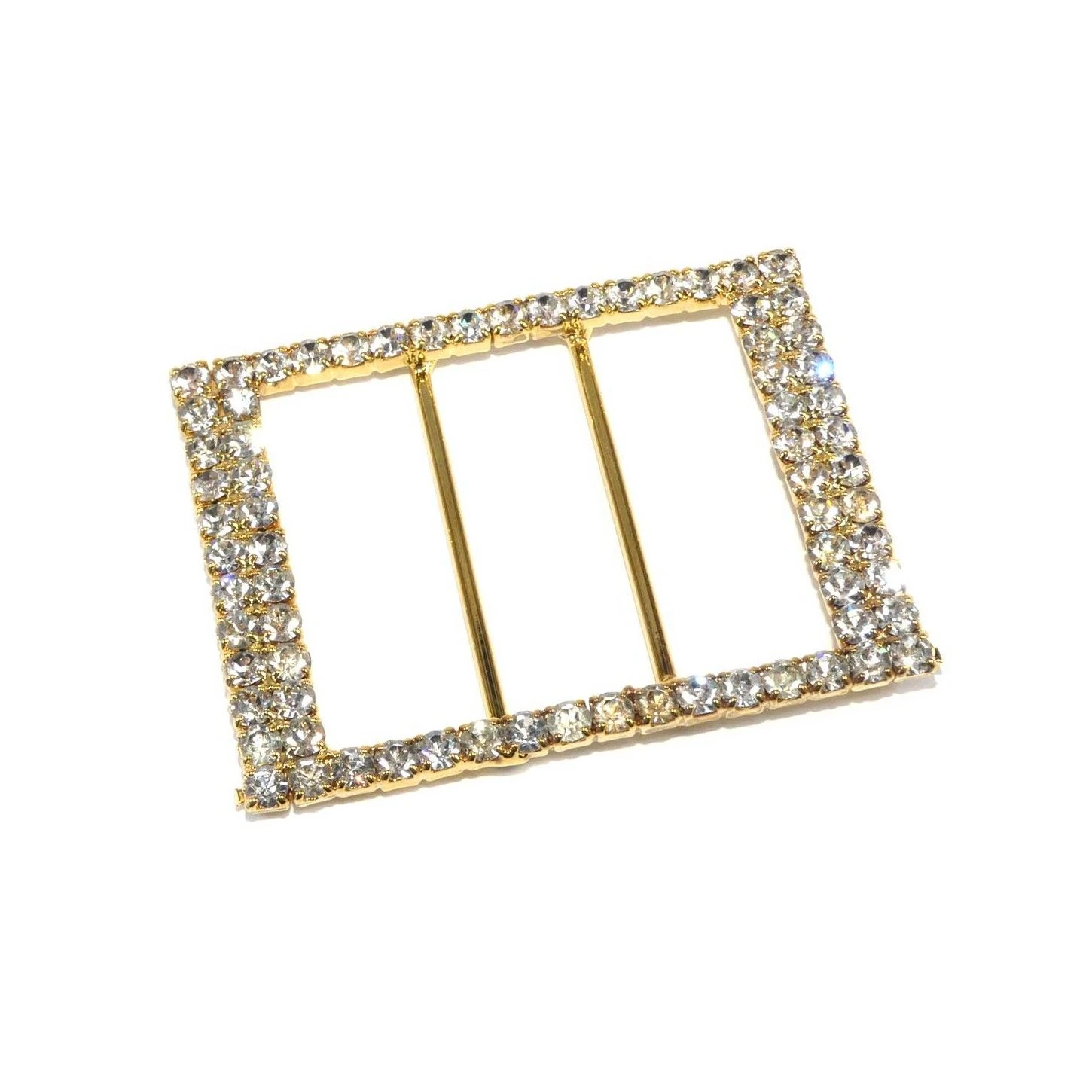 Esta hebilla metálica de color oro tiene forma rectangular e incluye a lo largo de todo su diseño strass engarzado para conseguir ese efecto de brillo que buscas.