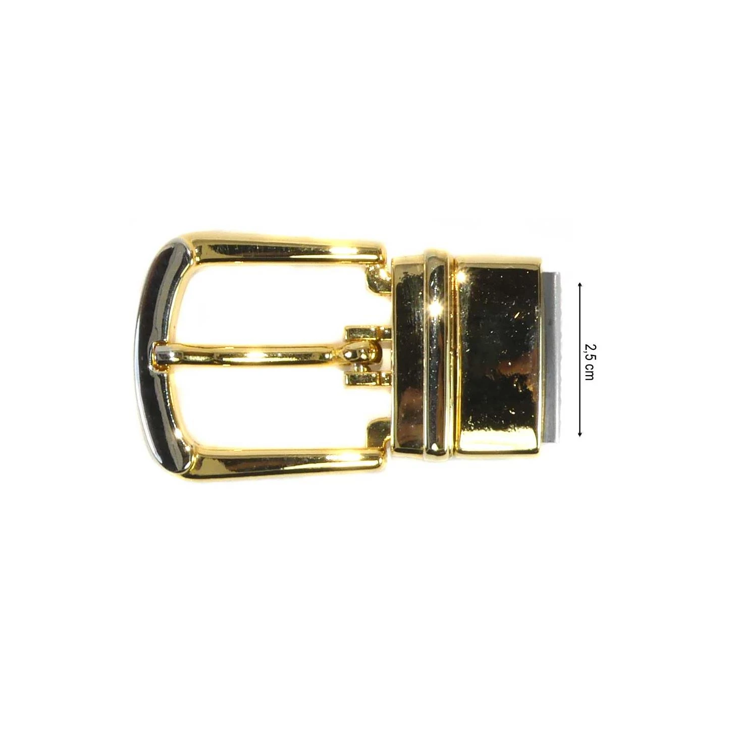 Hebilla metal en color dorado junto con plata con sistema de cepo de 2,5cm de ancho para el paso de cinta. Dimensiones 5,5cm de largo y 3,5cm de ancho.