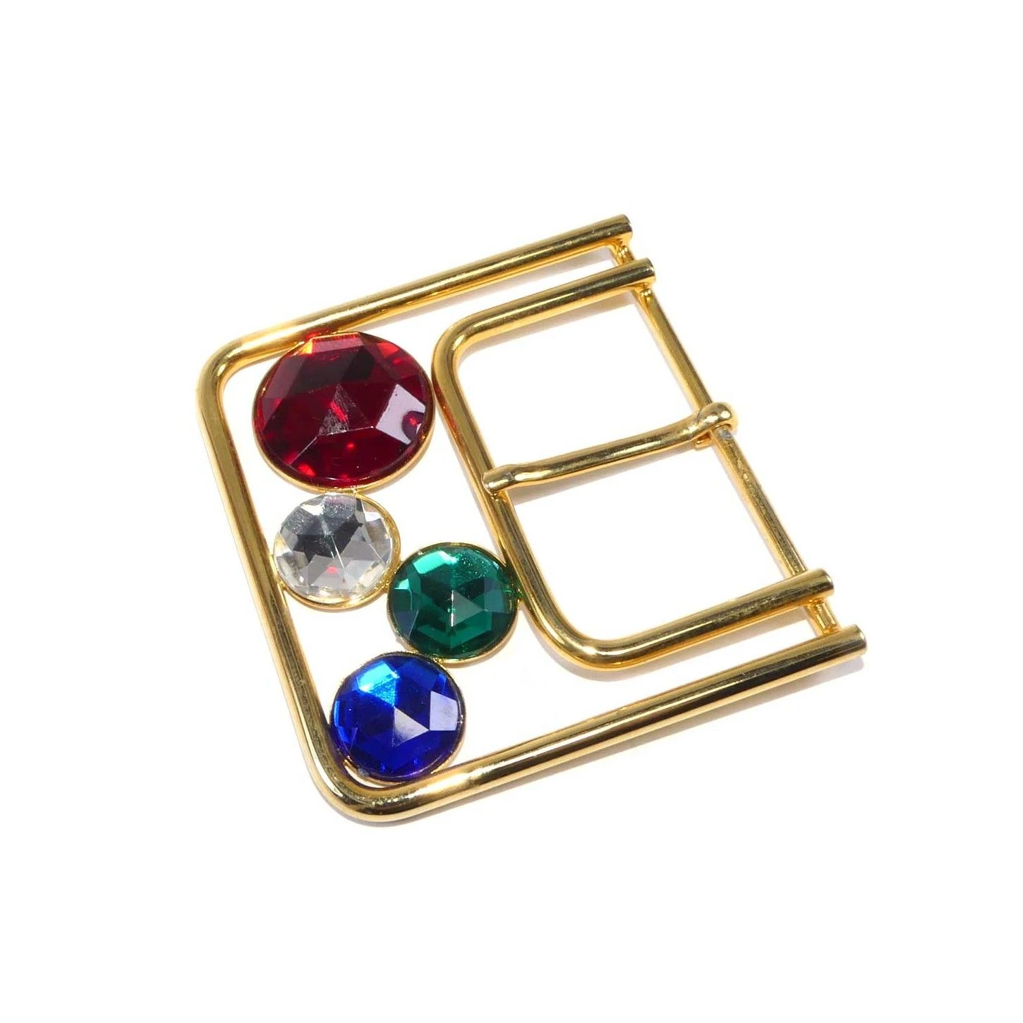 Esta hebilla metálica de color dorado y forma rectangular incluye en su diseño cuatro piedras de imitación al cristal de colores que dan un efecto elegante y único.