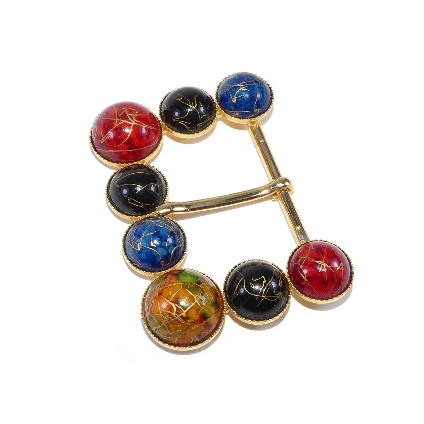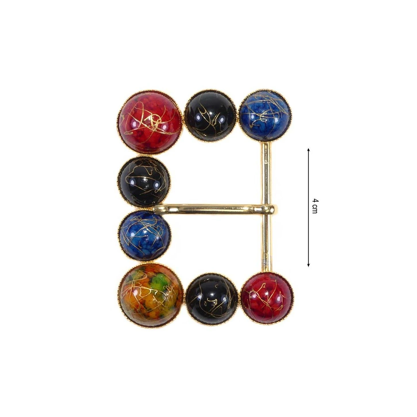 Esta original hebilla metálica con base metálica dorada y forma rectangular está rematada por semiesferas de colores que consiguen un diseño único y con mucho estilo.