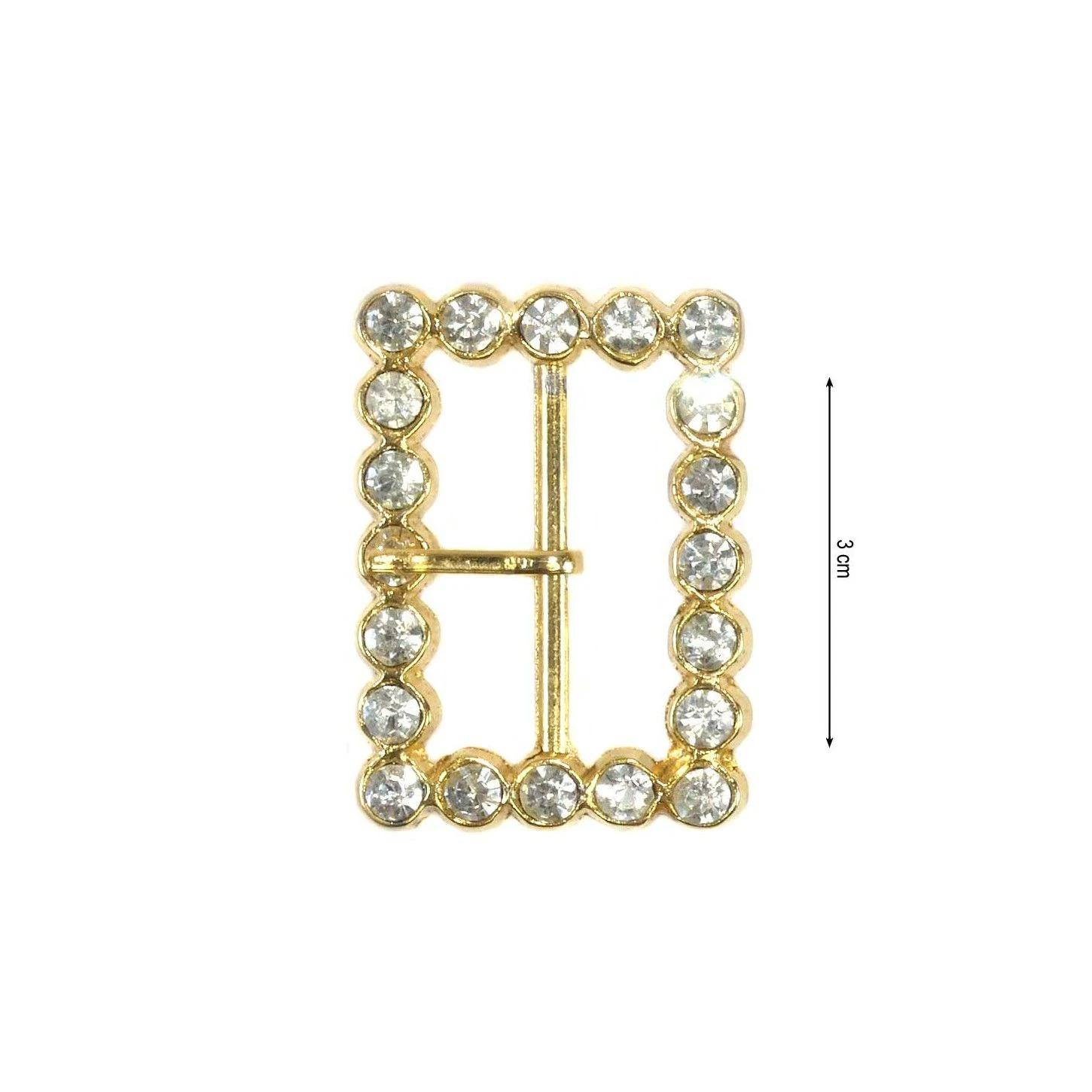 Esta hebilla metálica de color dorado y forma rectangular incluye a lo largo de todo su diseño strass o pequeños cristales que consiguen dar ese efecto que buscas.