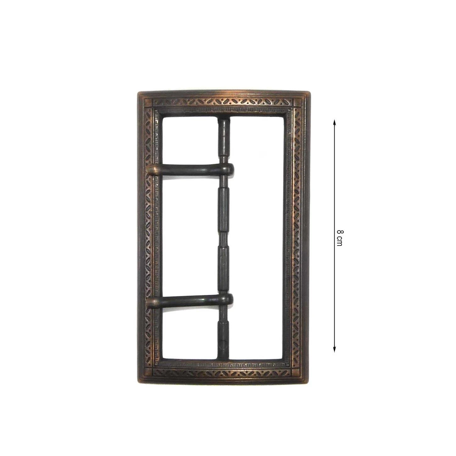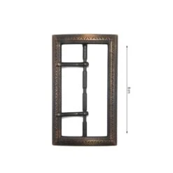 Hebilla metálica rectangular con doble pala y labrado decorativo de 8cm de paso para la cinta. Disponible en cobre.
