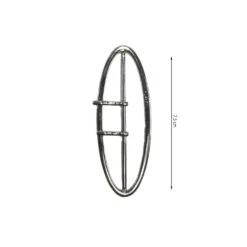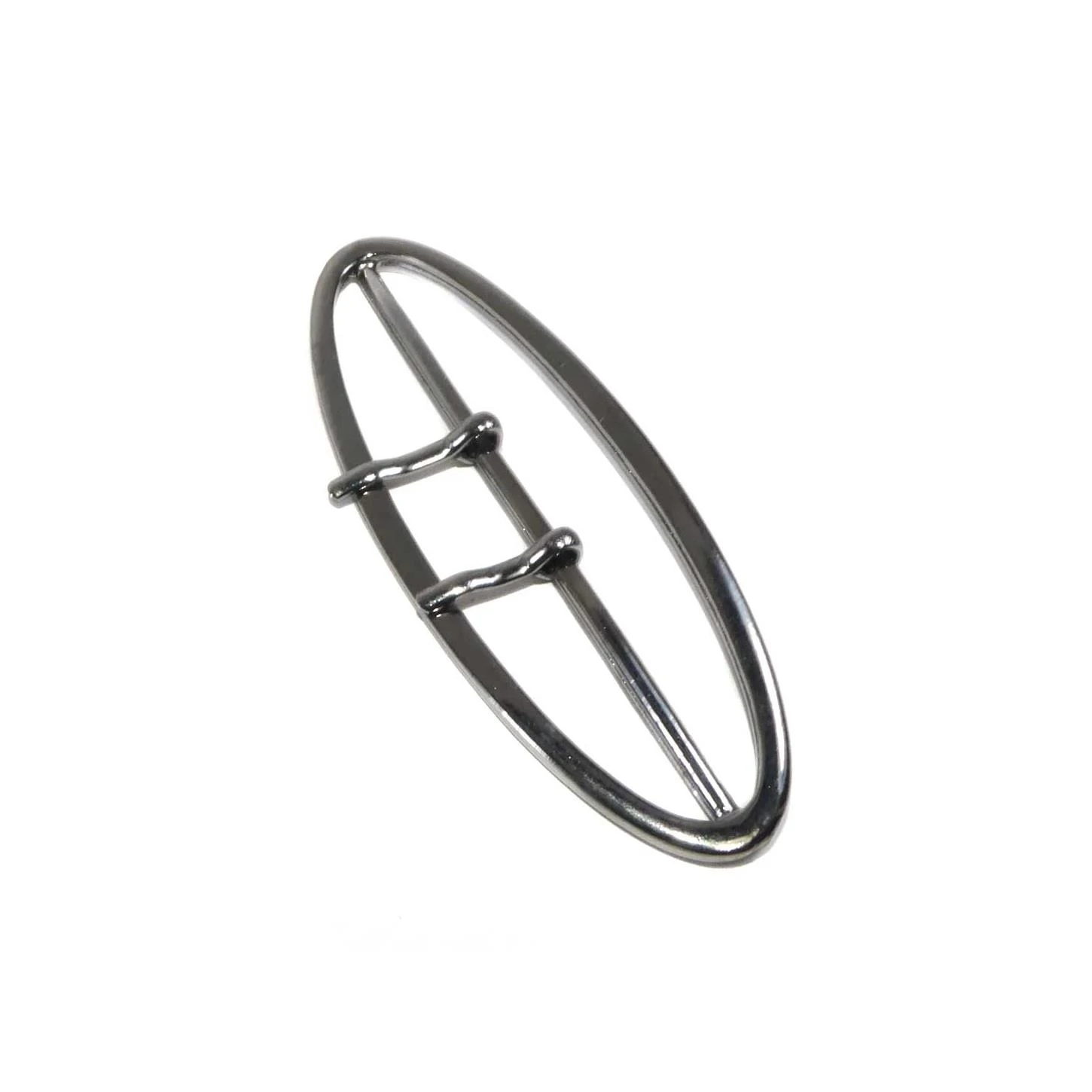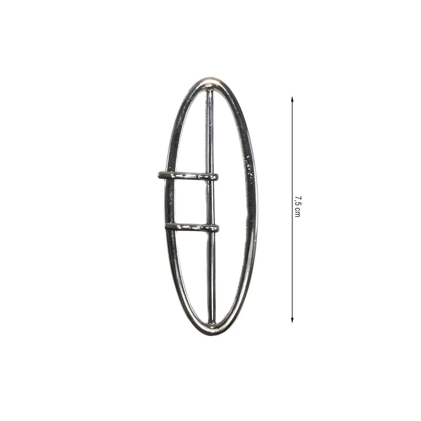 Hebilla metálica ovalada y estrecha, con 7,5cm de paso de cinta en color pavonado con doble gancho de sujección.