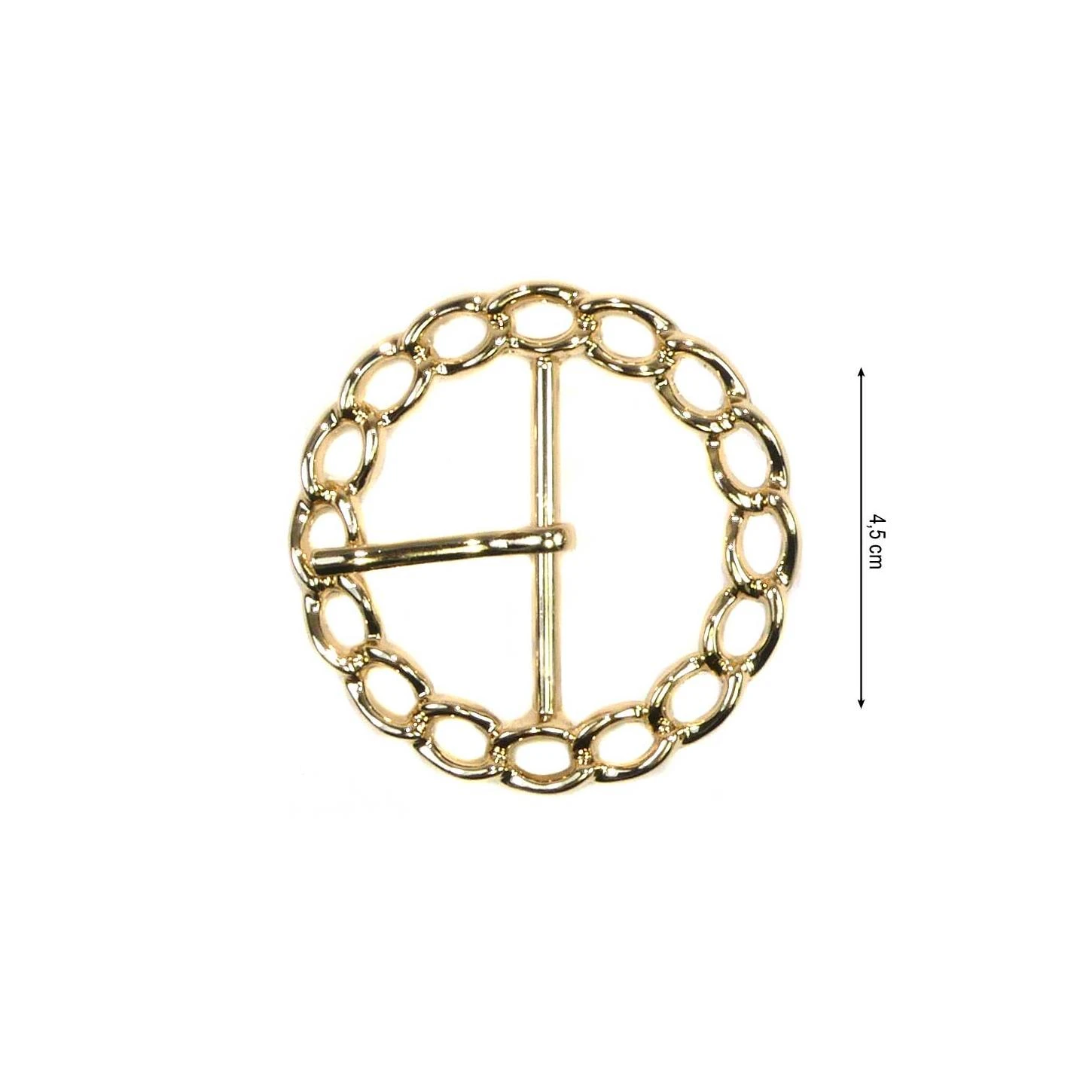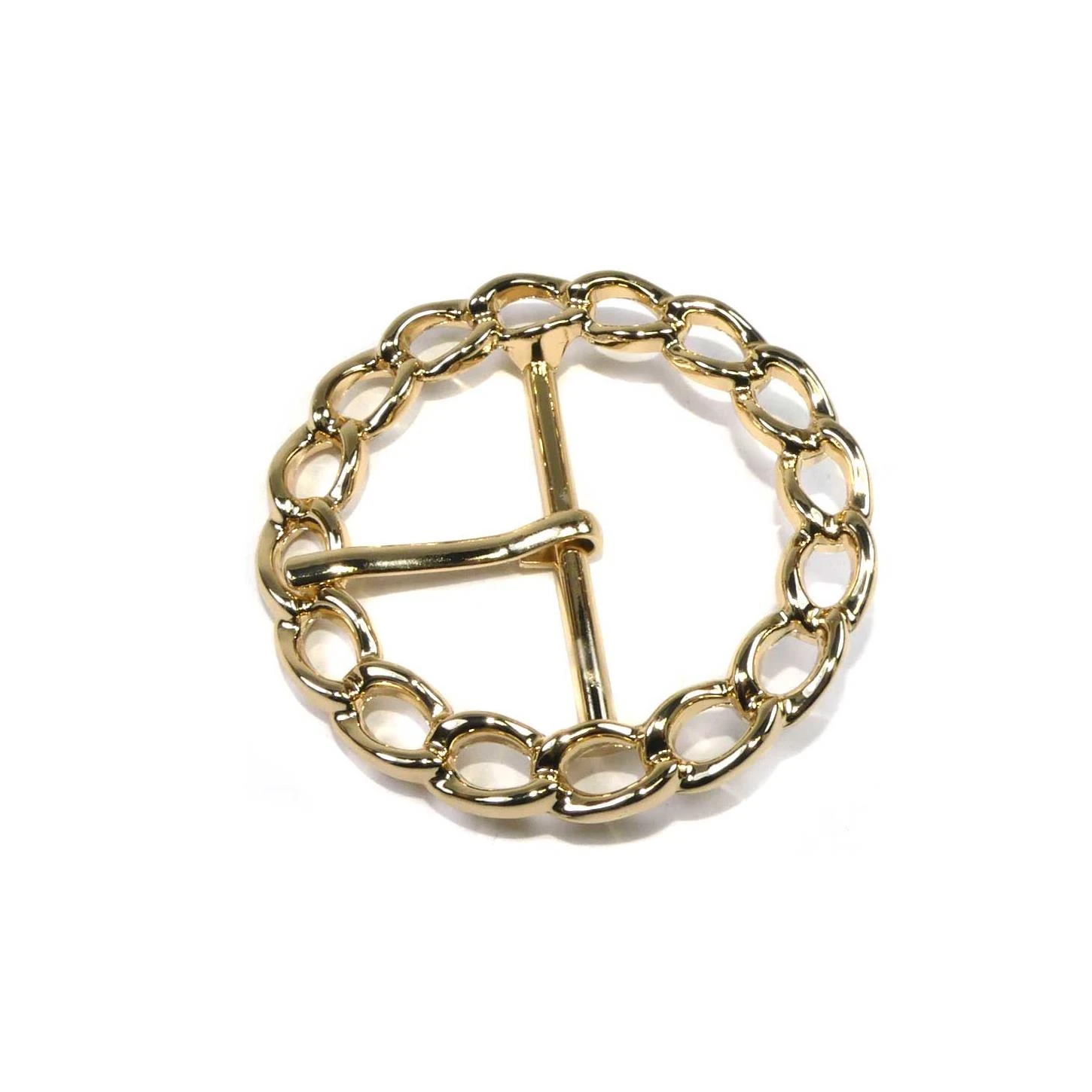 Hebilla metálica redonda con diseño de simil a cadena en color oro. De 4,5cm de paso de cinta y dimensiones 6,5cm de diámetro.