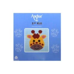 Kit de medio punto infantil. Incluye tejido de cañamazo perforado en cuadrícula de 15x15cm con estampado de jirafa, hilos de lana Anchor, aguja sin punta e instrucciones de uso.