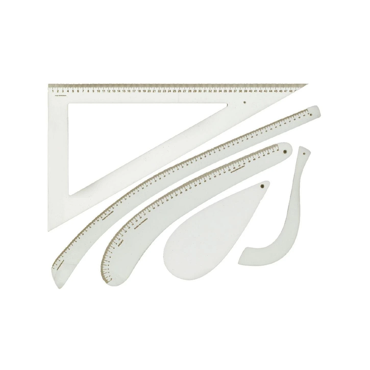 Conjunto de 5 reglas de diseño rígidas: una escuadra de 54cm de longitud, un tiro de cadera, una curva variable, una sisa para cuellos y una para mangas. Disponible en negro y transparente. Seleccionar el color deseado a continuación.