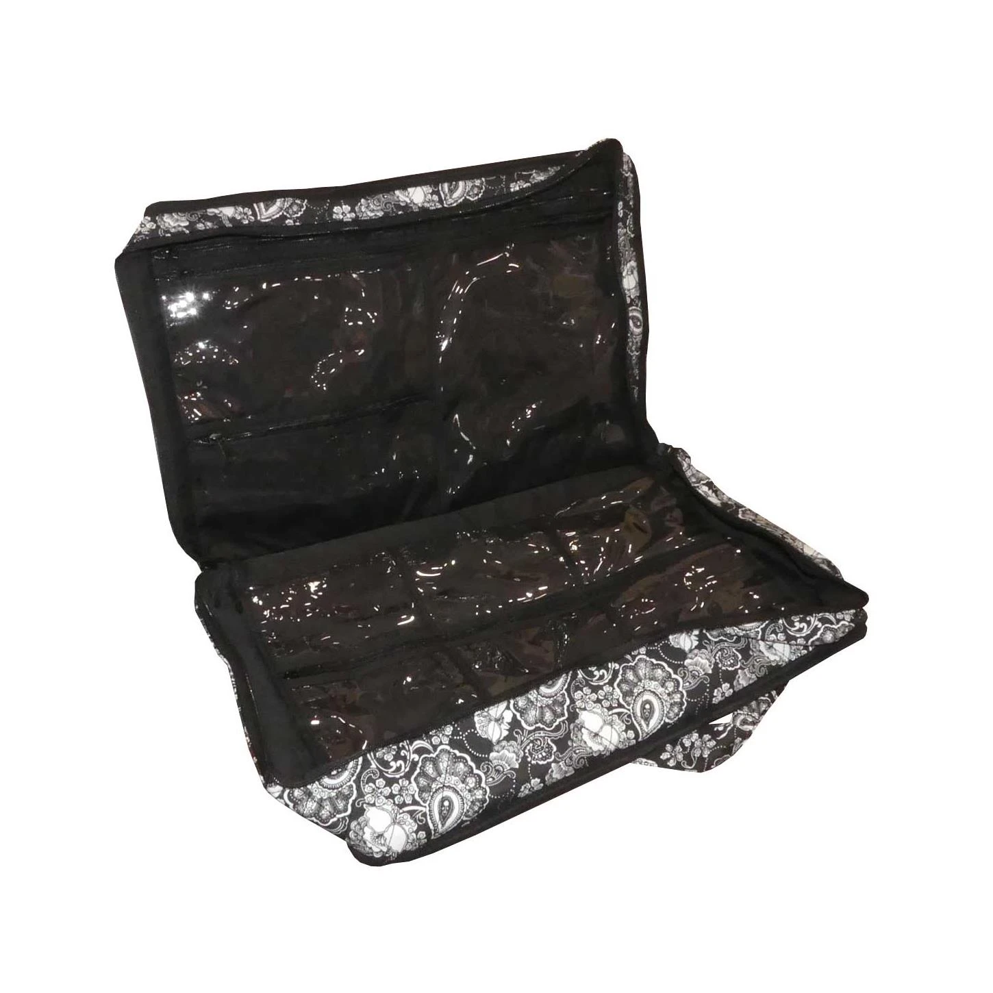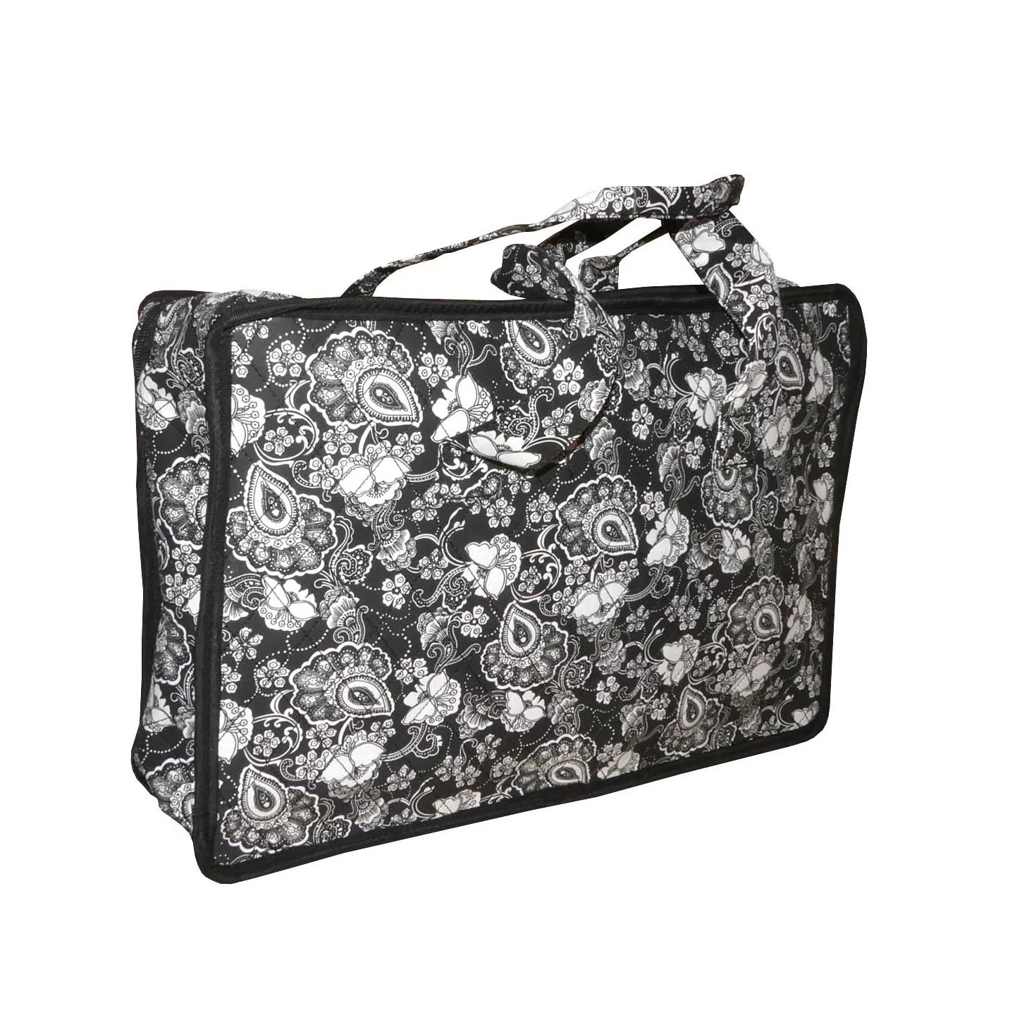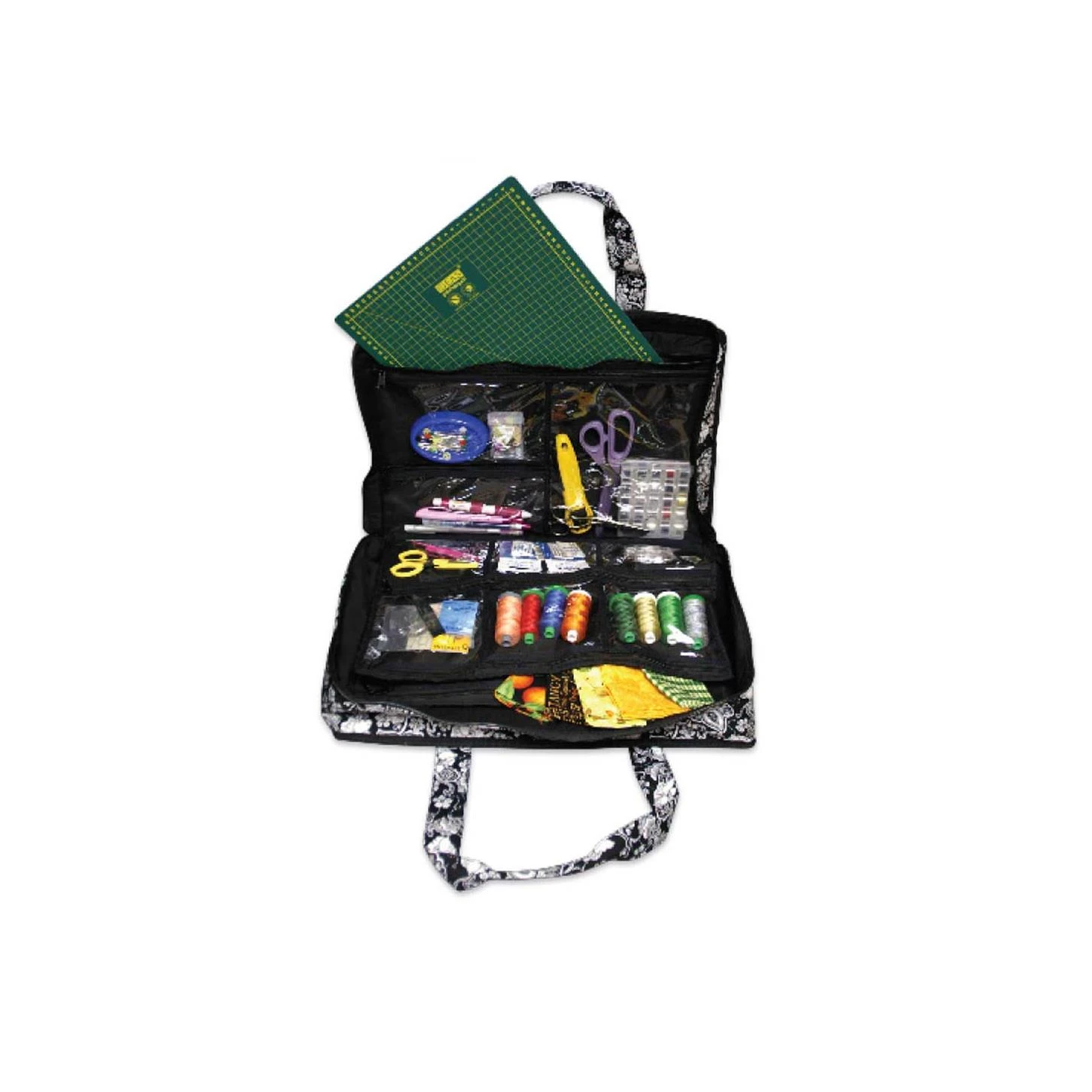 Incorpora dos asas para poder transportar fácilmente y en su interior encontraremos un gran espacio con múltiples compartimentos para poder introducir la base de corte, telas, hilos y demás elementos de costura o labores.