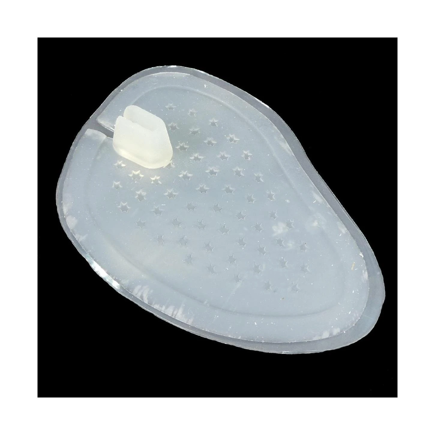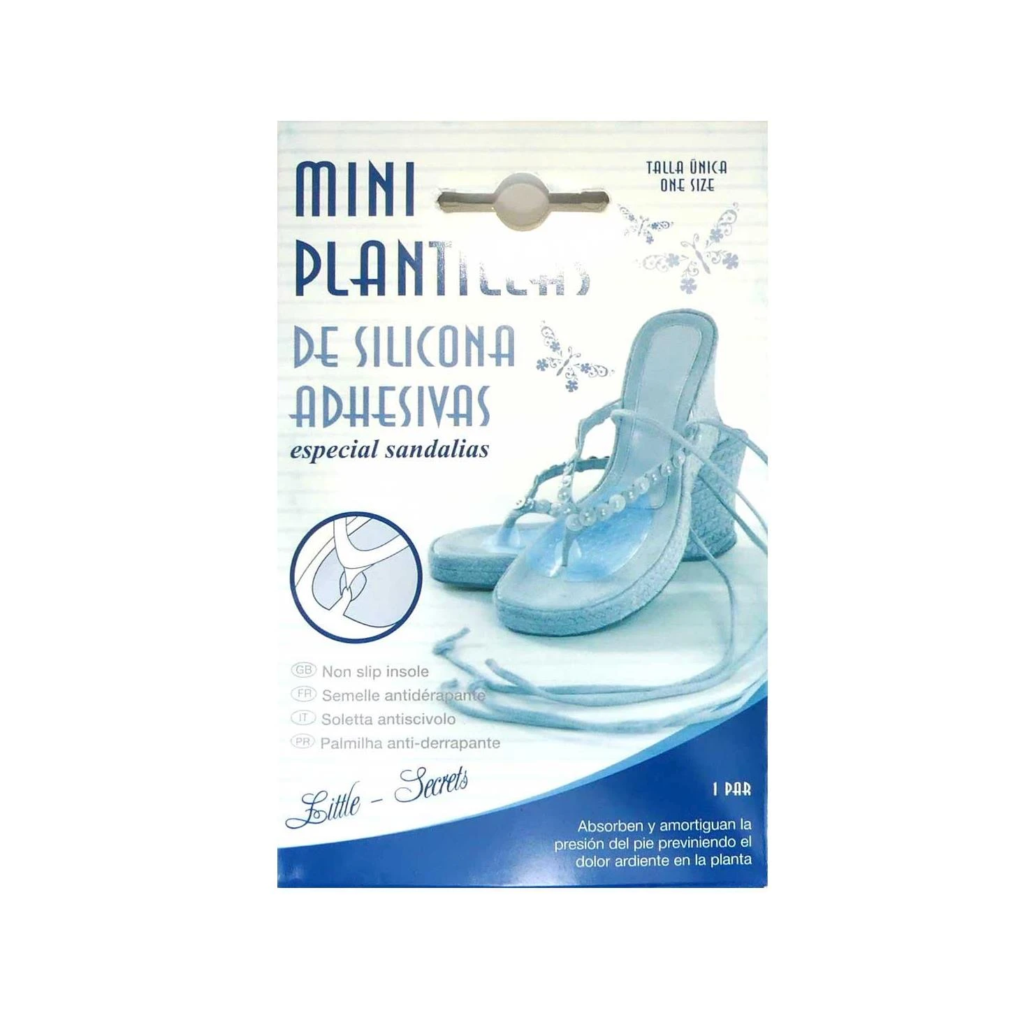 Mini plantillas de silicona adhesivas, de talla única y especiales para sandalias al llevar incorporada una pieza para proteger la zona de separación entre dedos. De 9cm de longitud y 7cm de ancho.