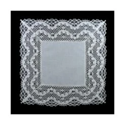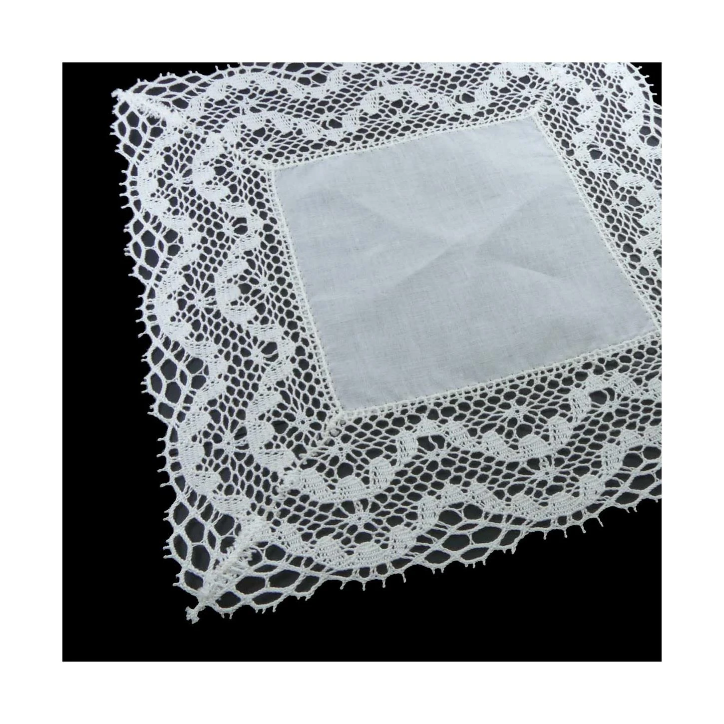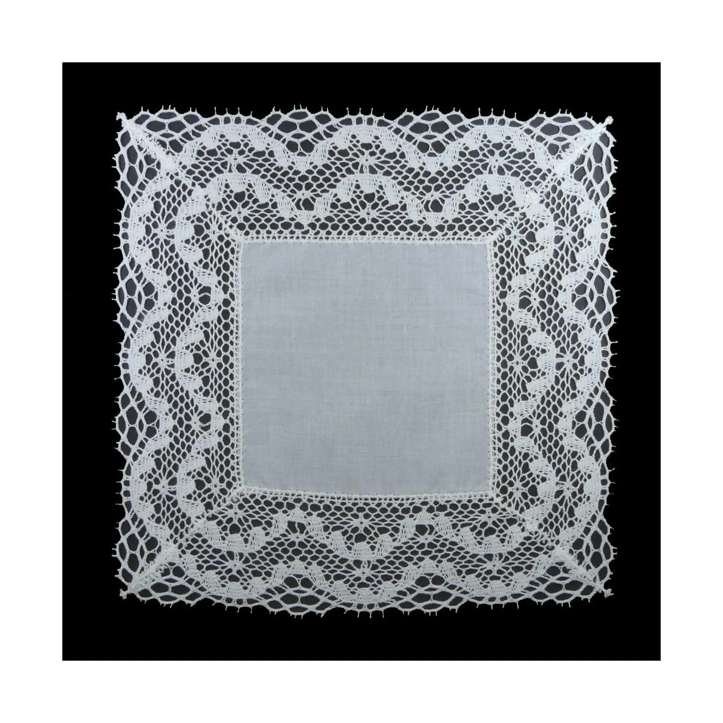 Pañuelo blanco con remate de puntilla de bolillo de 5cm de ancha con diseño en ondas.