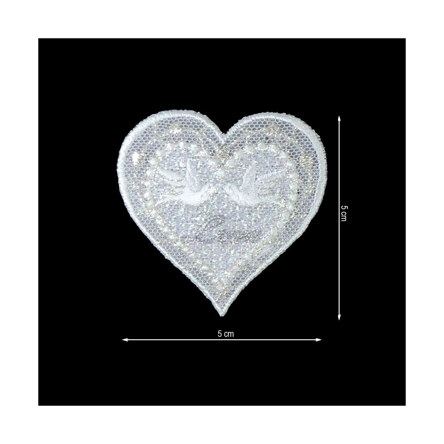 Parche termoadhesivo bordado con forma de corazón en blanco y bordado interior en plata. De 5cm de ancho y 5cm de alto.