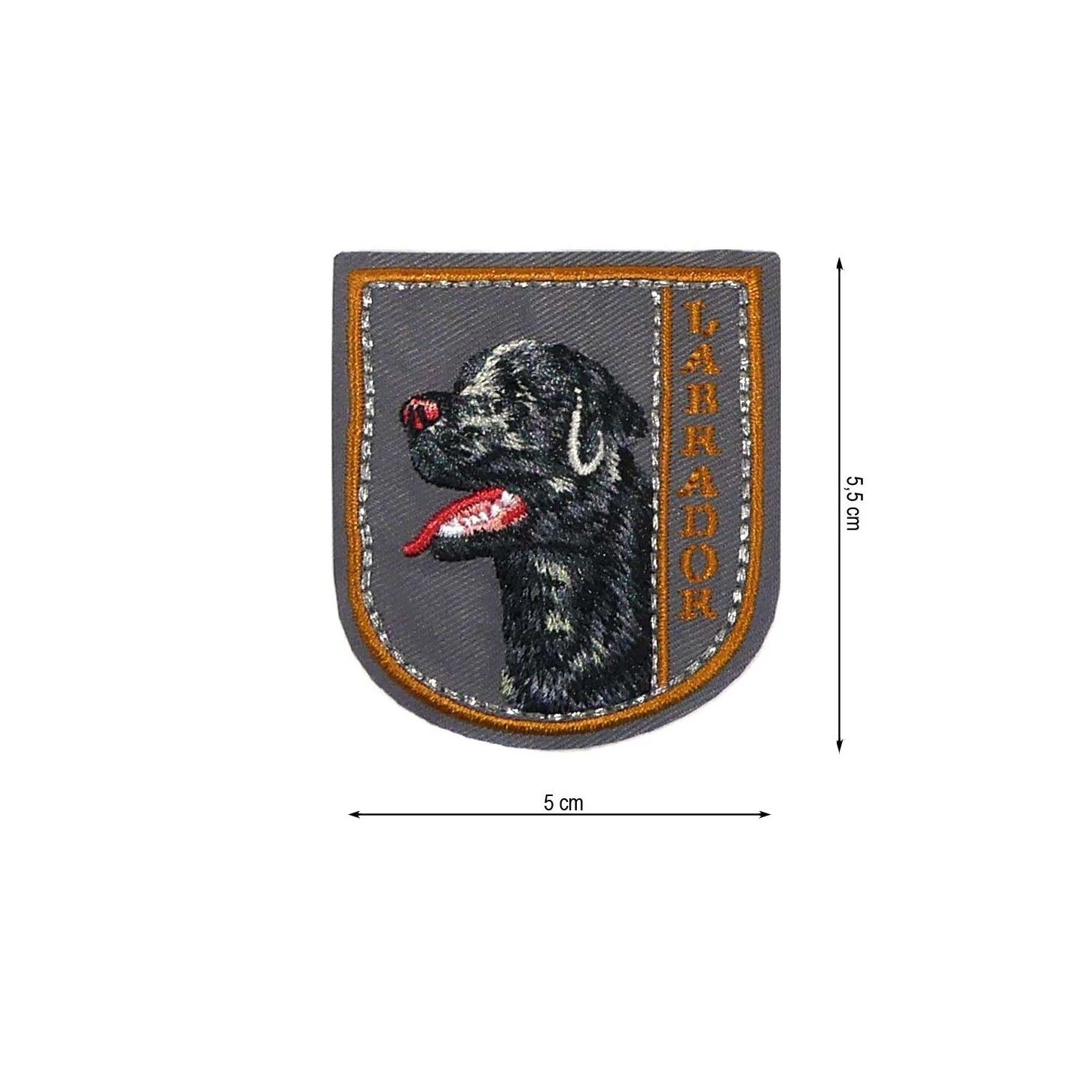 Parche termoadhesivo bordado con forma de escudo gris y bordado a color de un perro labrador negro. De 5cm de ancho y 5,5cm de alto.