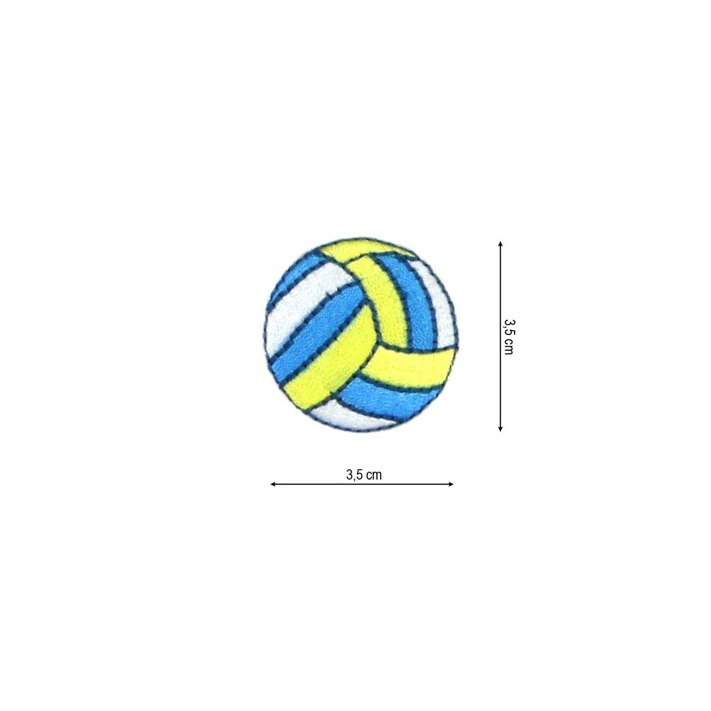 Parche termoadhesivo bordado con forma de pelota de voleibol azul, blanco y amarillo. De 3,5cm de diámetro.