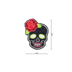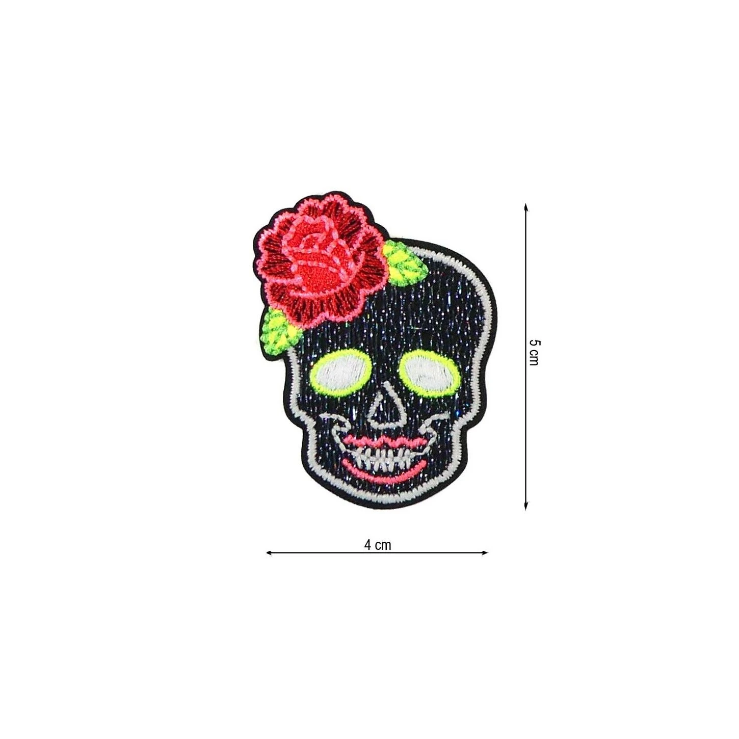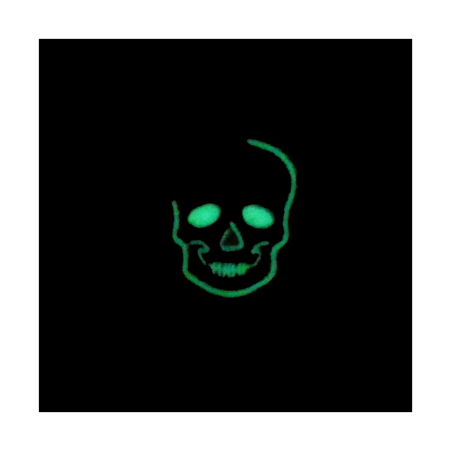 Parche termoadhesivo en forma de calavera con bordado en hilo fluorescente (brilla en la oscuridad) y dimensiones 4cm de ancho y 5cm de alto.