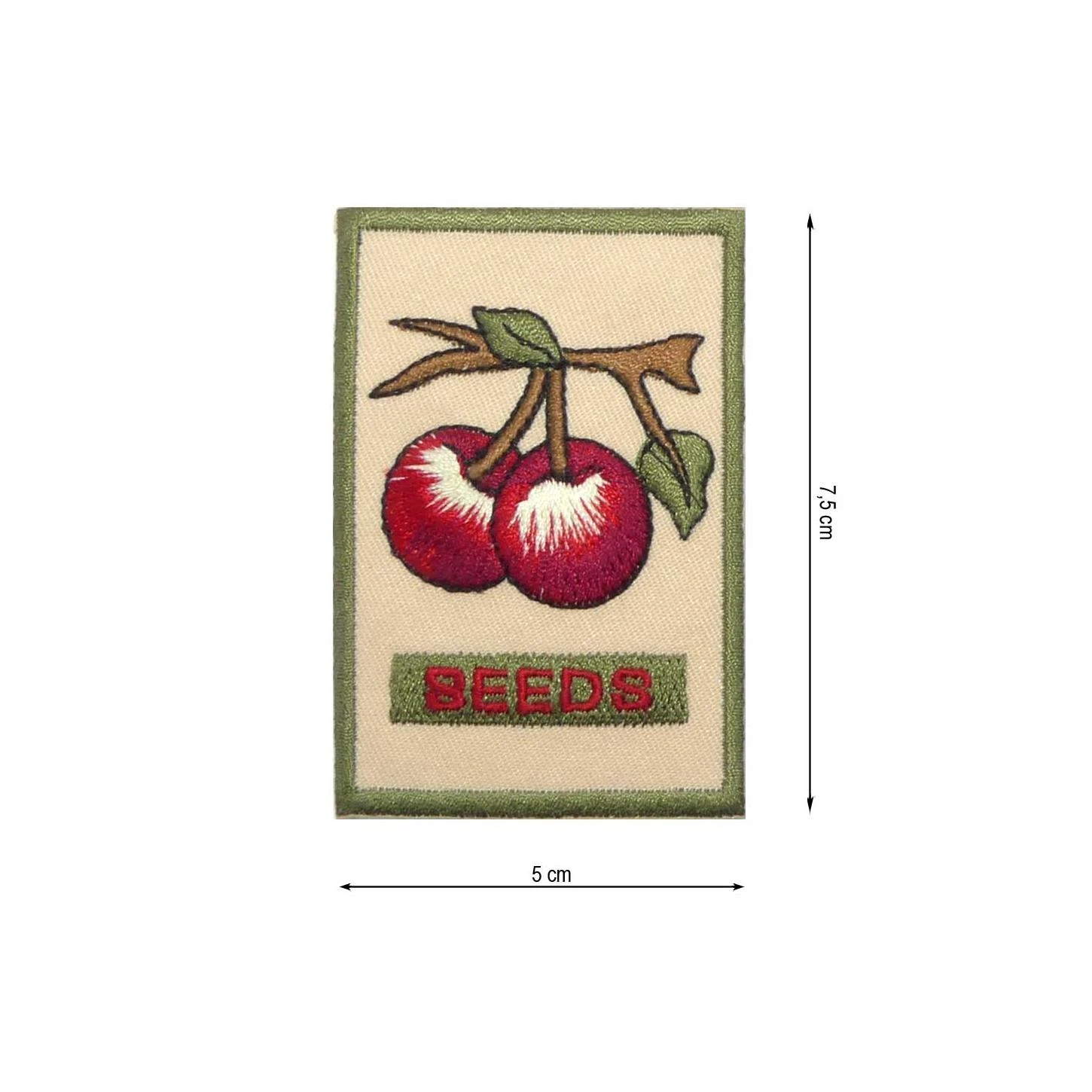 Parche bordado termoadhesivo con forma de cuadro con unas cerezas rojas en su interior. Las dimensiones del mismo son 5cm de ancho y 7,5cm de alto.