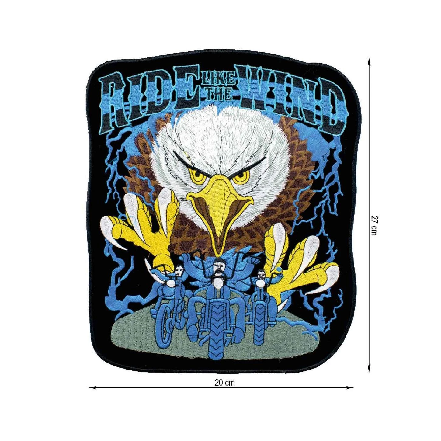 Parche termoadhesivo para moteros con fondo en negro y bordado de diseño de motoristas y águila americana. Dimensiones: 20cm de ancho y 27cm de alto.