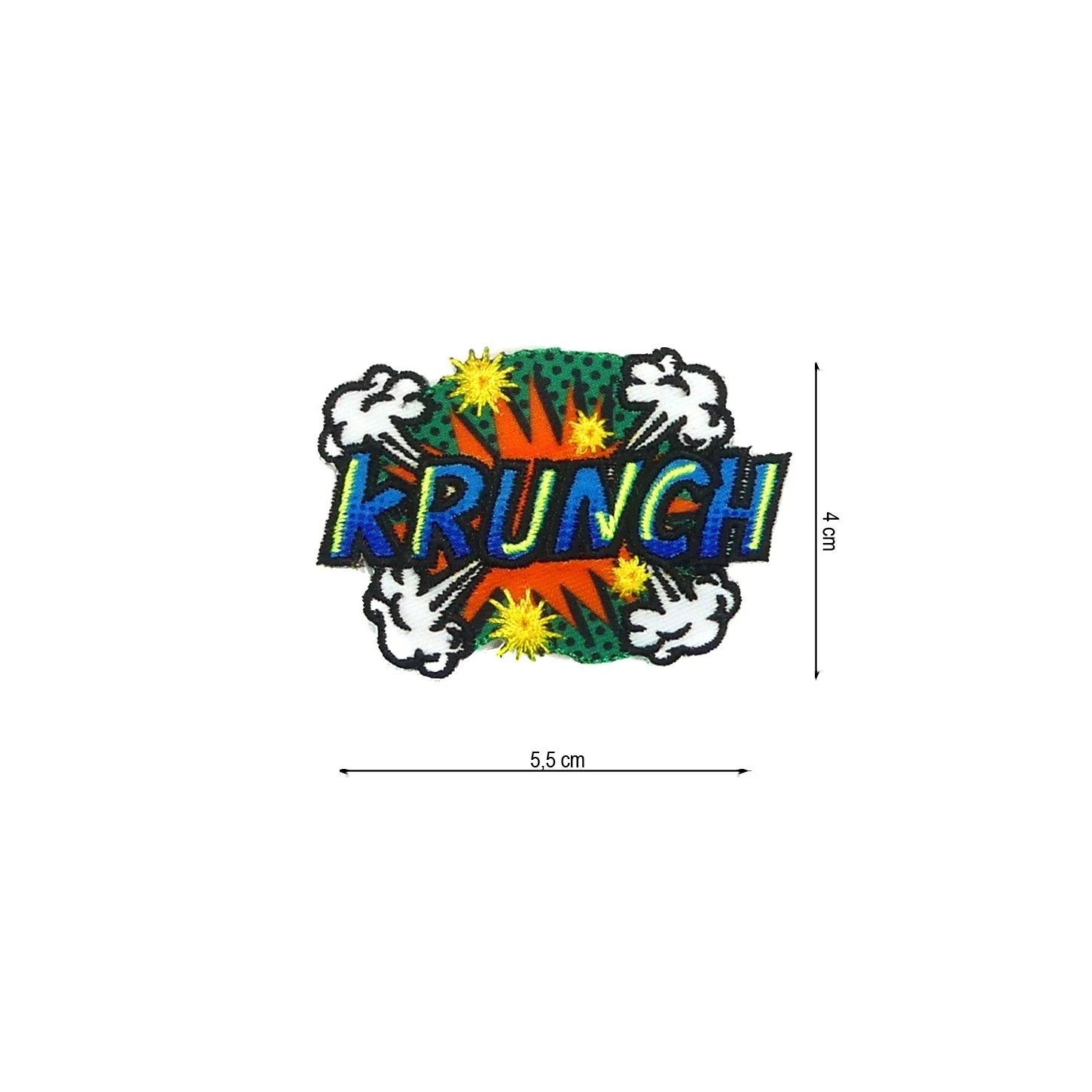 Parche termoadhesivo bordado con estilo vintage de colores llamativos y palabra «krunch» en su interior. Dimensiones: 5,5cm de ancho y 4cm de alto.