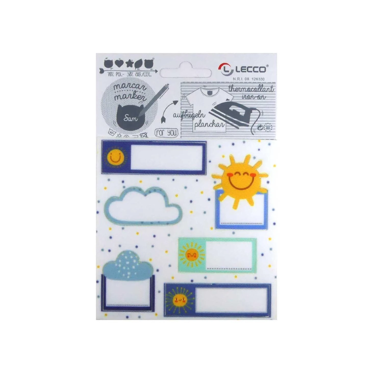 Parches termoadhesivos para marcar prendas infantiles con forma variadas y estampados de nubes y soles.