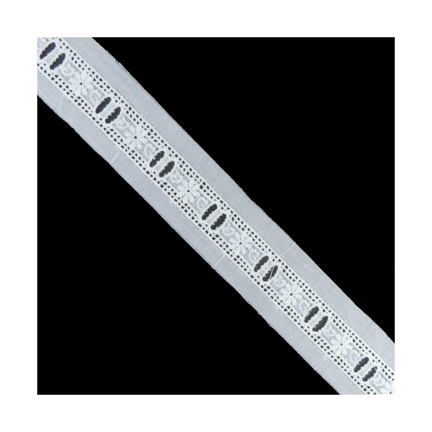 Pasacintas de tira bordada en batista realizado con algodón y de 1,5cm de ancho con 6mm de paso de cinta. En color blanco, con diseño de cenefa floral y laterales rectos.