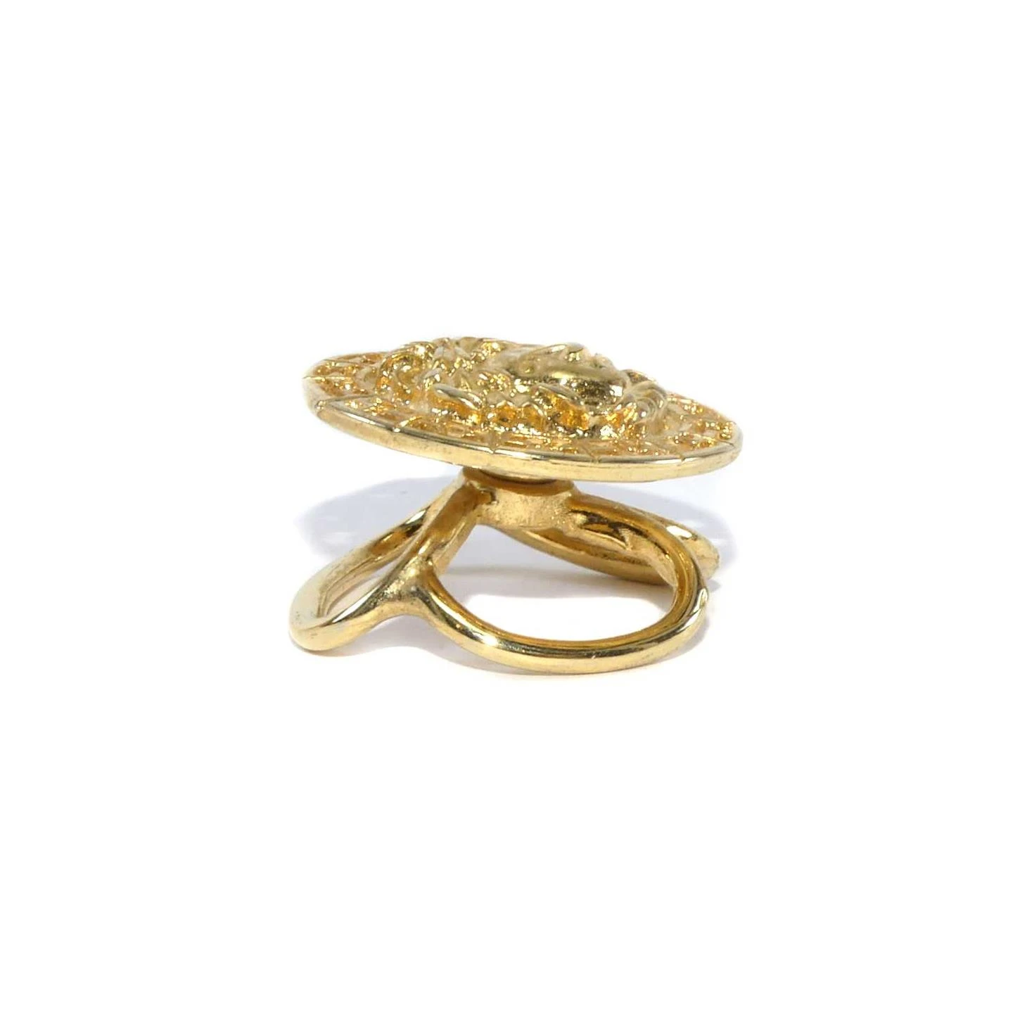 Pasador decorativo para sujetar pañuelos al cuello realizado en metal lacado en dorado y con diseño de cabeza de mujer.
