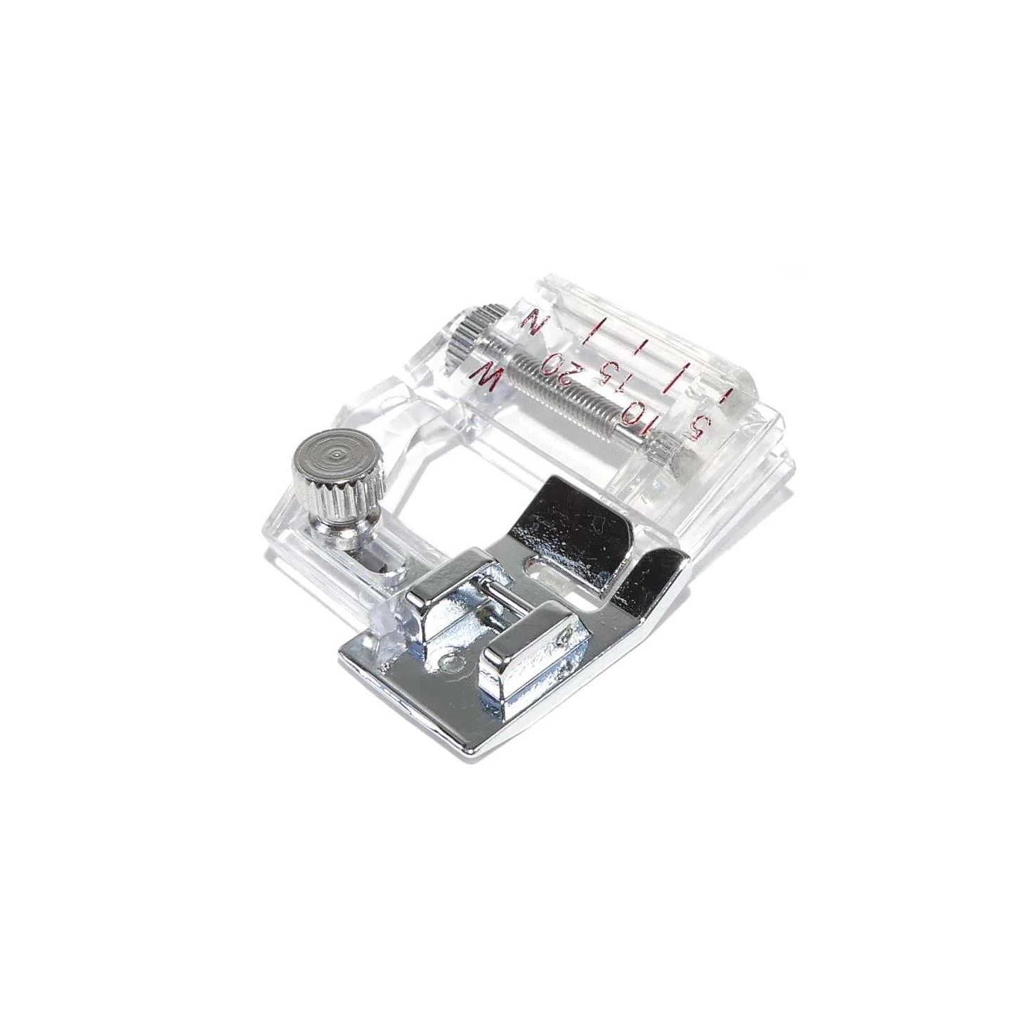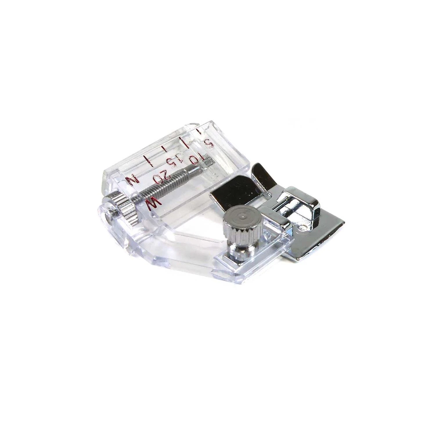 Pie prensatelas para máquina de coser que facilita la realización de bieses en diferentes anchos. Ajustable y realizado en acero de alta calidad.