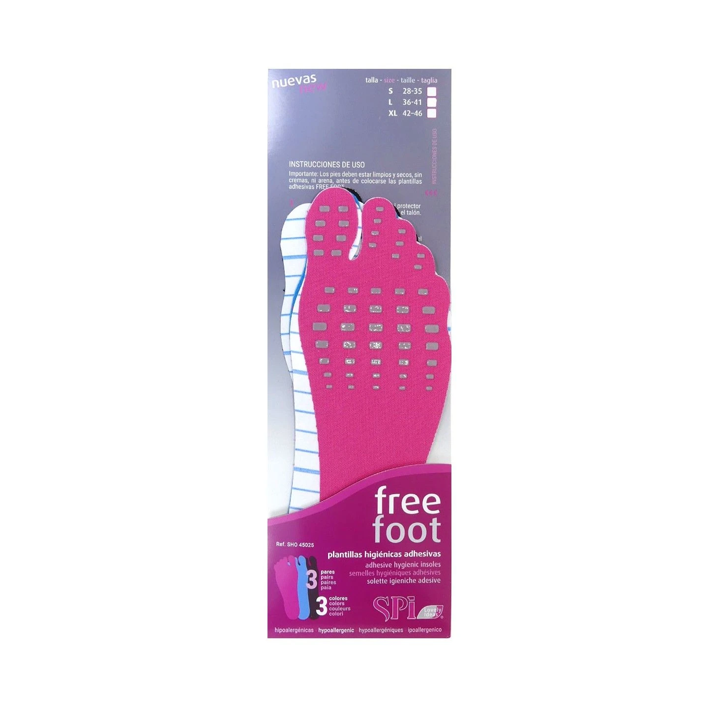 Se presentan en un conjunto de tres pares de plantillas de la misma talla. Los colores son: fuxia, negro y turquesa.