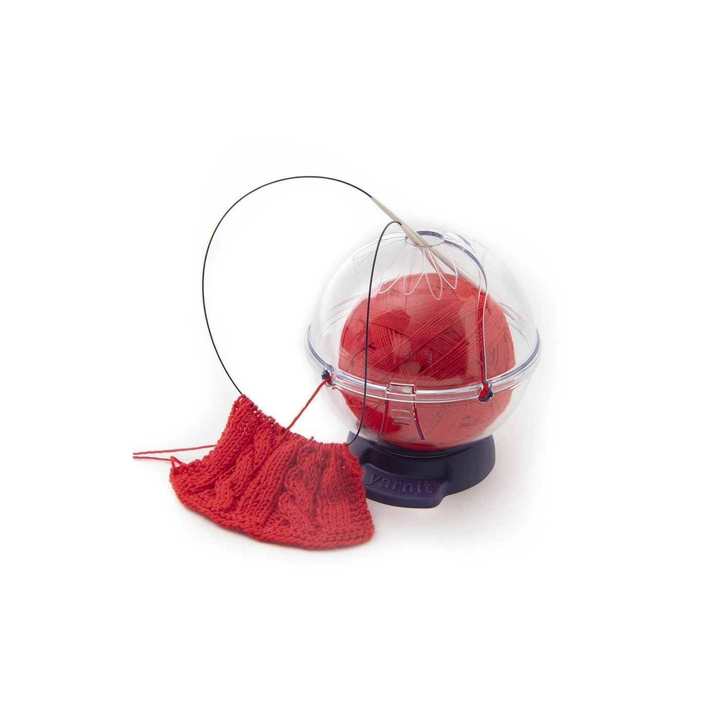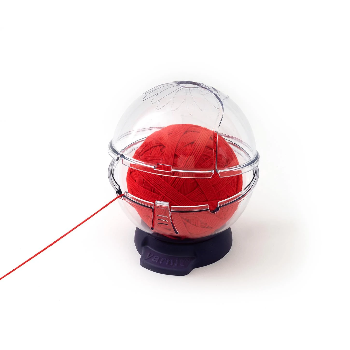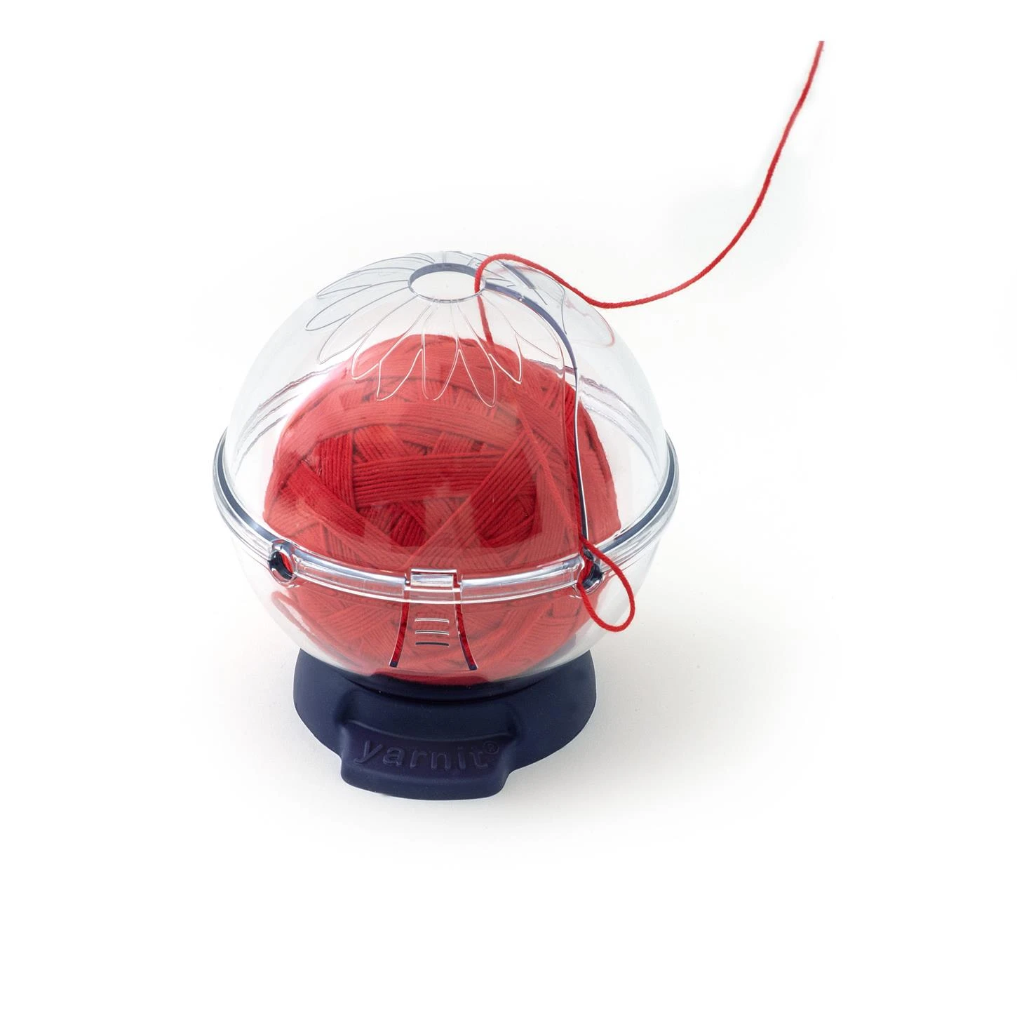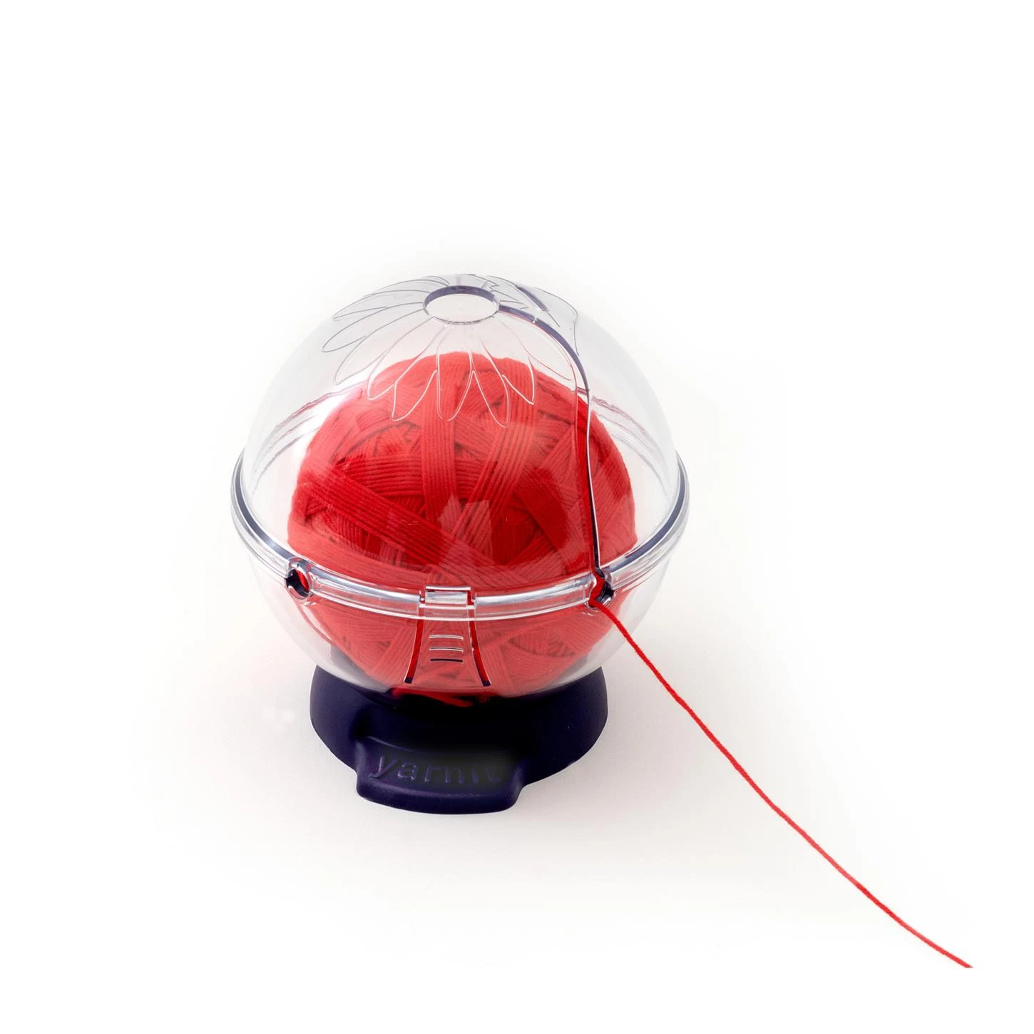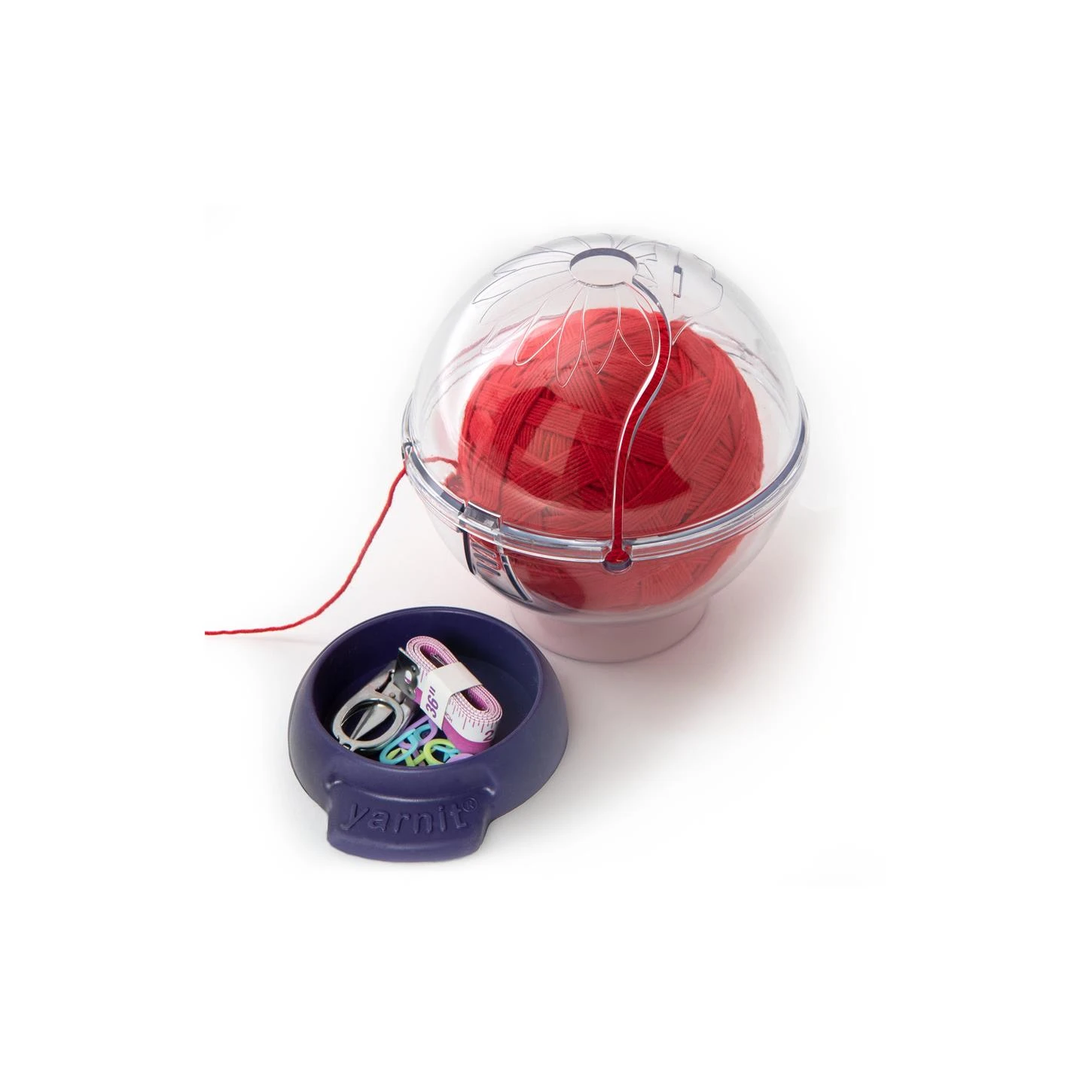Estuche transparente para guardar el ovillo mientras se realiza la labor de crochet o tricotado. Con dos orificios para la entrada y salida de la hebra y pequeño cofre para útiles pequeños.