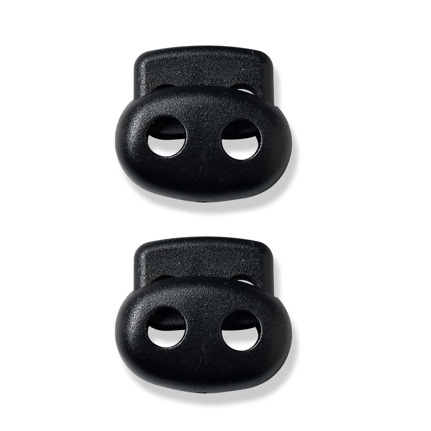 Clásico cierre para cordón de material acrílico, de forma plana, con dos perforaciones para poder introducir el cordón de no más de 5mm de diámetro.