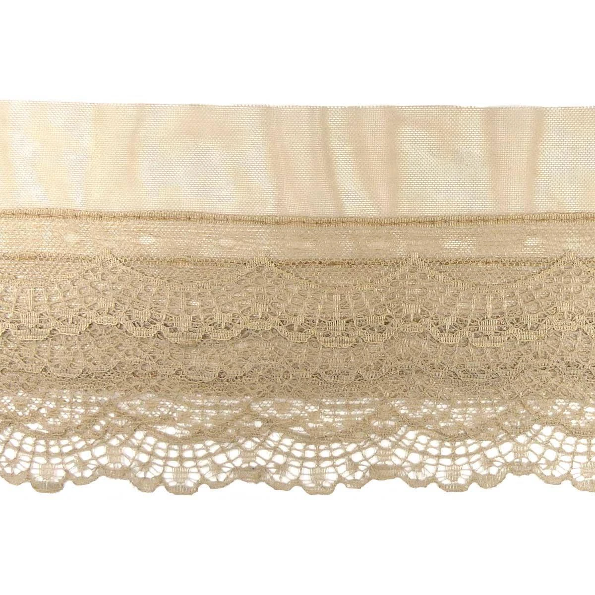 Puntilla de nylón de 8cm de ancho conformada por 4 capas de puntillas, realizada en 100% poliéster con tul, motivos geométricos y terminación en ondas. Puede lavarse sin problemas hasta los 40º, admite plancha y se recomienda no introducir en secadora.