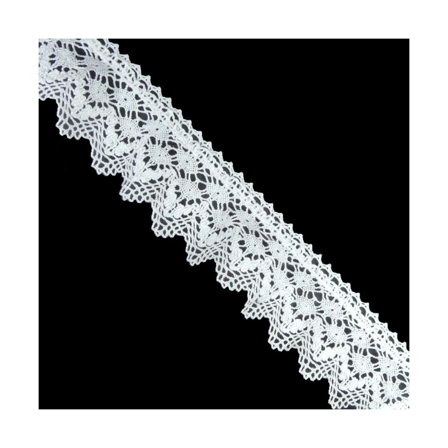 Puntilla de bolillo de color blanco, semifruncida y de 4cm de ancho. Con acabado en picos y diseño clásico de zigzag y dos filas de óvalos.