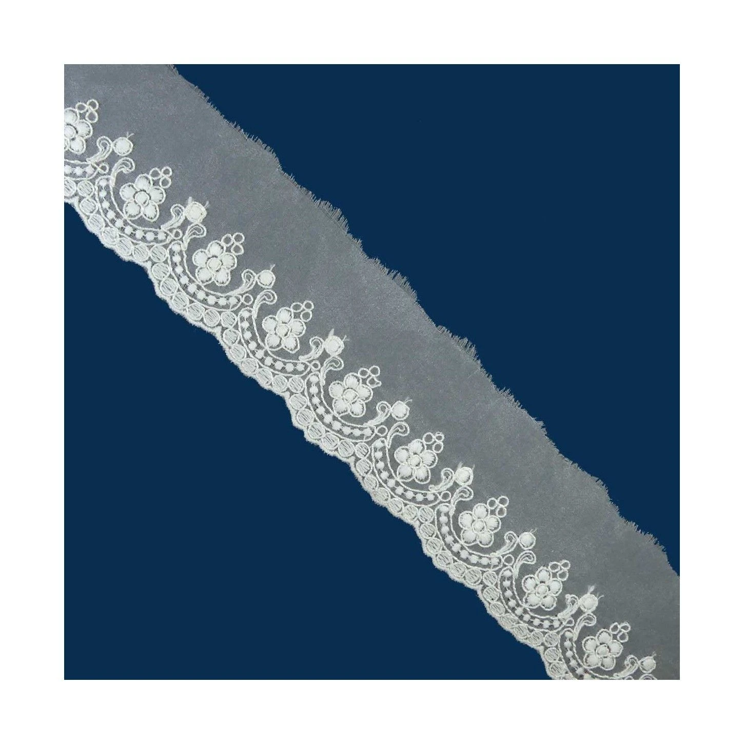 Tira bordada realizada en organza y de 4,5cm de ancho total. En color crudo, con diseño de arcos y flores.