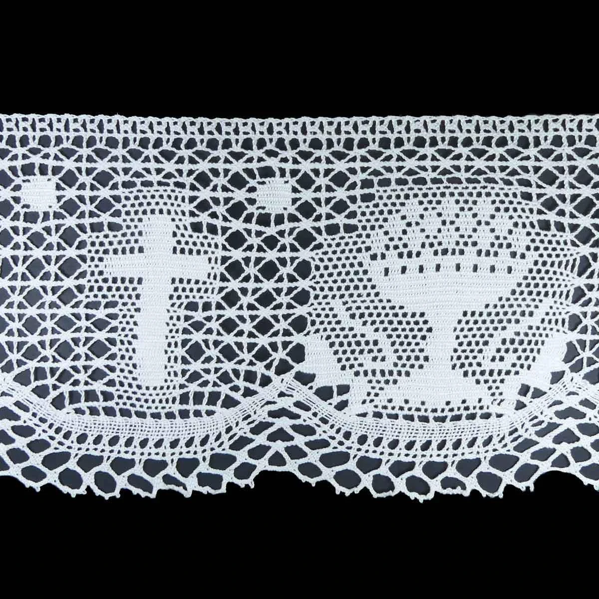 Puntilla de bolillo en blanco y diseño religioso con cruz cristiana y cáliz. Posee el cuerpo característico del bolillo, lo que le confiere un aspecto clásico. De ancho total 14cm.