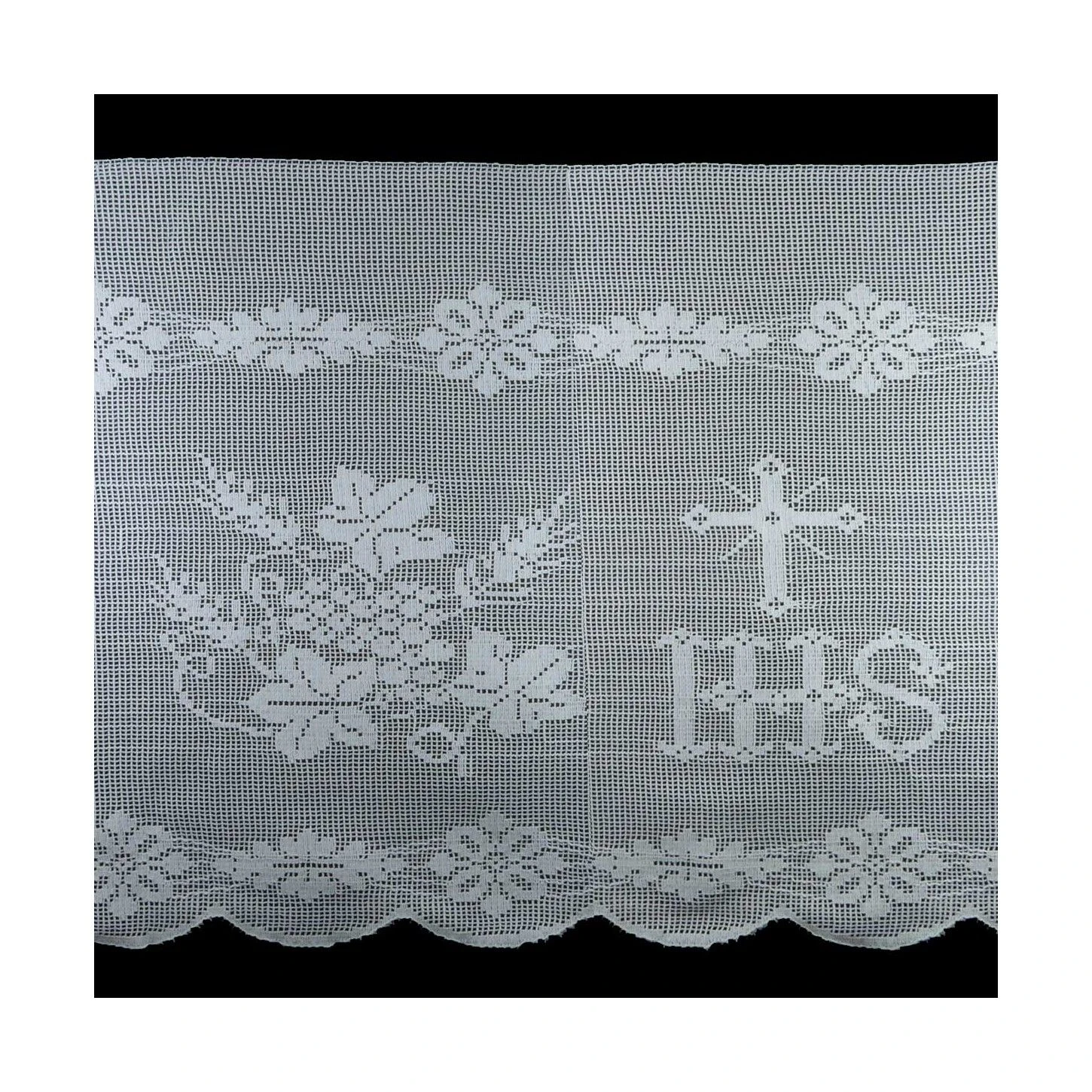 Puntilla de bolillo en blanco y diseño religioso con cruz, insignia JHS, ramos y flores. Posee el cuerpo característico del bolillo, lo que le confiere un aspecto clásico. De ancho total 27cm.