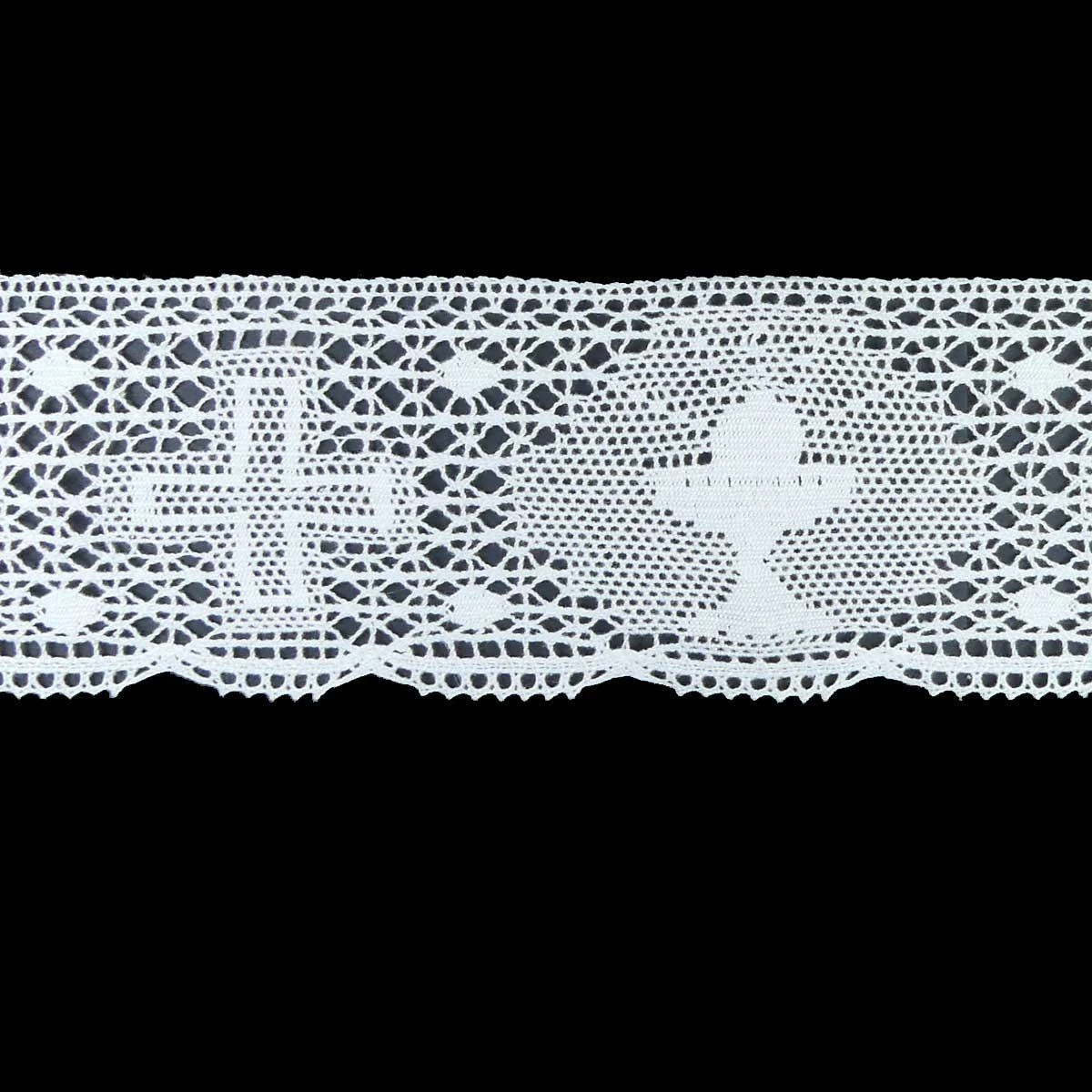 Puntilla de bolillo en blanco y diseño religioso con cruz cristiana y cáliz. Posee el cuerpo característico del bolillo, lo que le confiere un aspecto clásico. De ancho total 5,5cm.