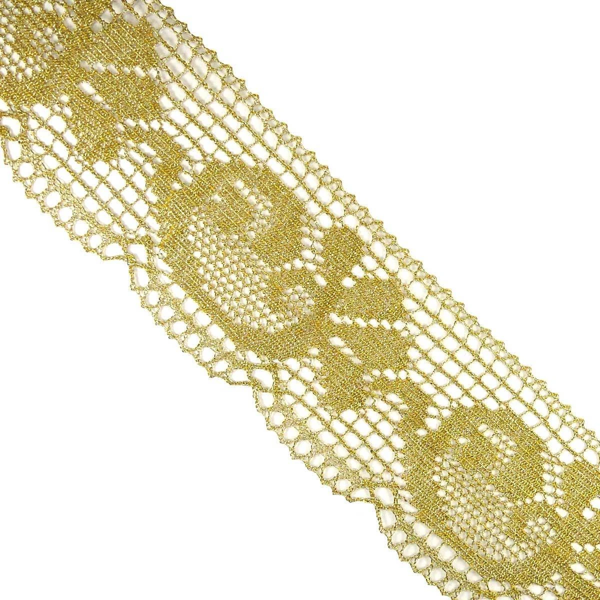 Puntilla de bolillo de 6,8cm de ancho realizada con hilo dorado. Puede lavarse sin problemas hasta los 30º, admite plancha y se recomienda no introducir en secadora.