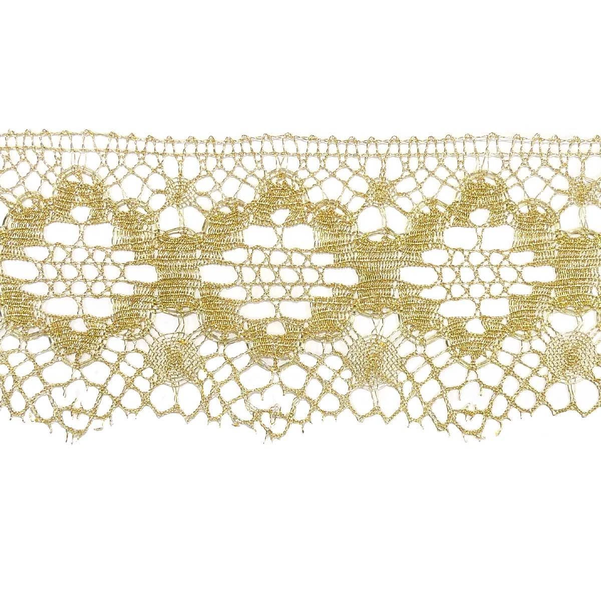 Puntilla de bolillo de 9,5cm de ancho realizada con hilo de metal dorado. Puede lavarse sin problemas hasta los 30º, admite plancha y se recomienda no introducir en secadora.