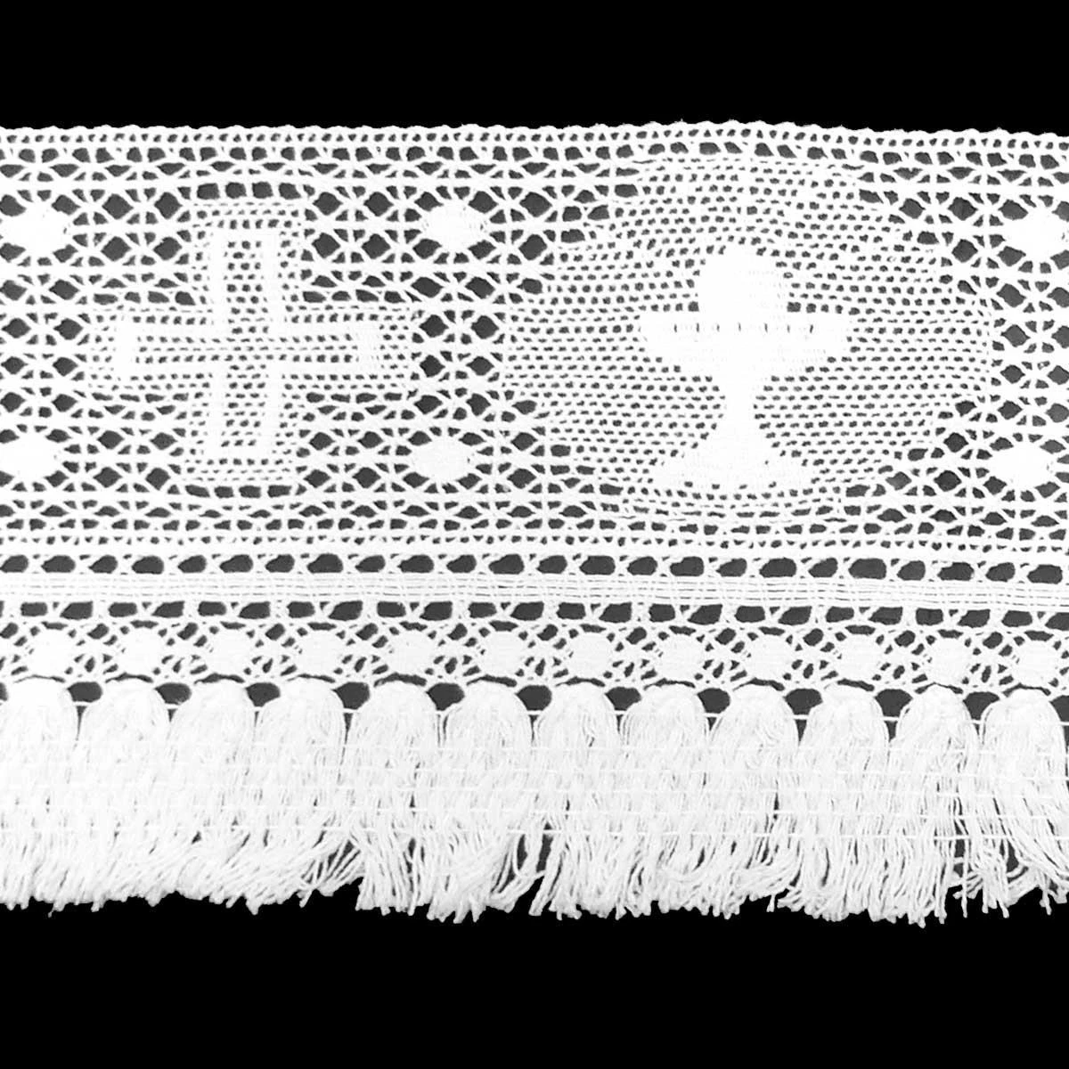 Puntilla de bolillo en blanco con fleco de algodón y diseño religioso con cruz cristiana y cáliz. Posee el cuerpo característico del bolillo, lo que le confiere un aspecto clásico. De ancho total 20cm.