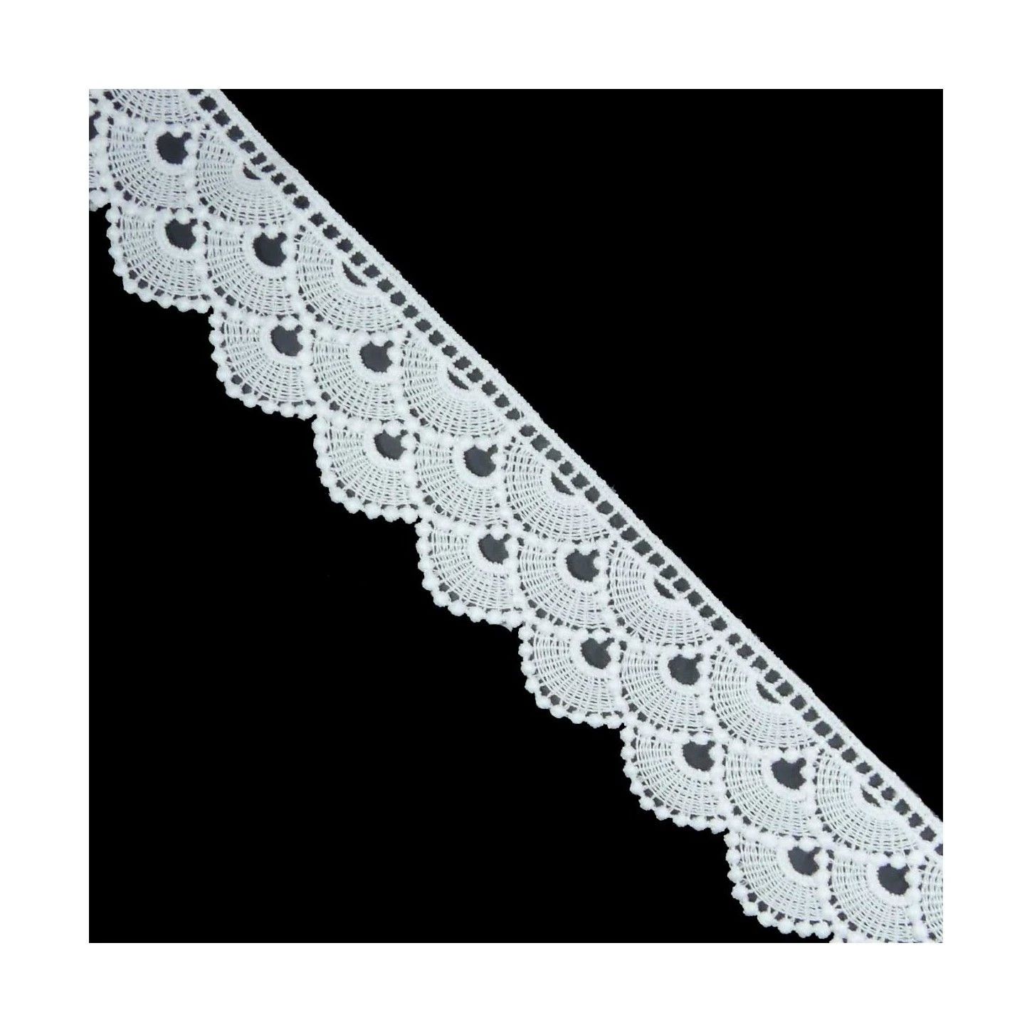 Puntilla de guipur de 3,7m de ancho y con diseño de festones. 100 % poliéster.