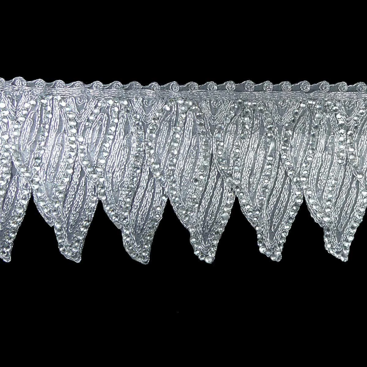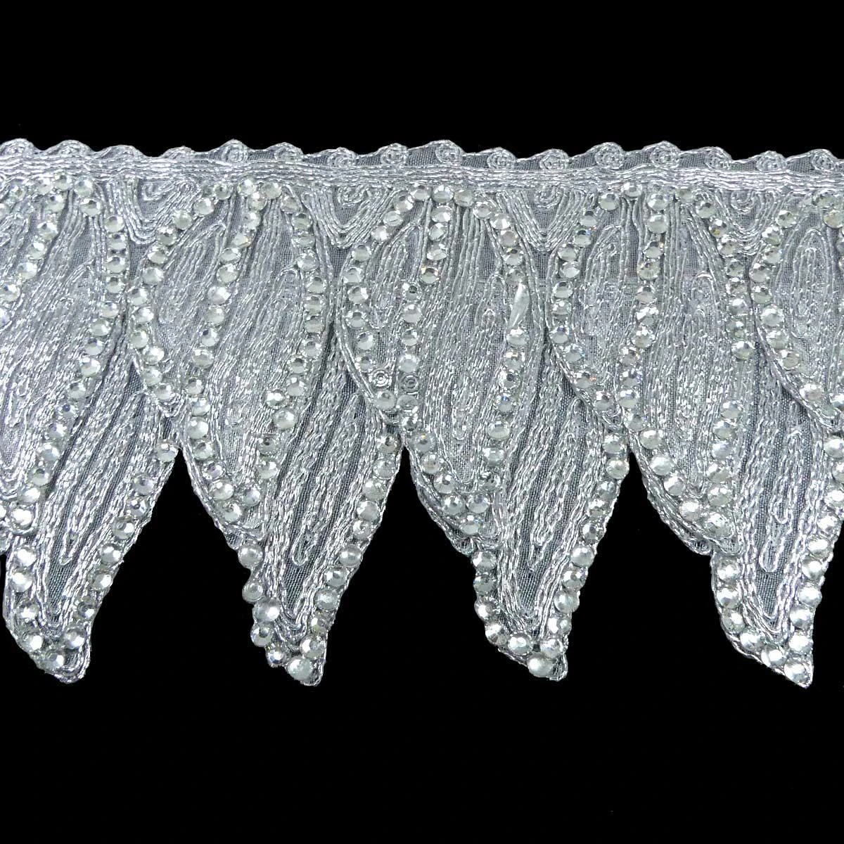 Esta preciosa pieza de 9,5cm de ancho está realizada con hilo metalizado en plateado consiguiendo un grosor característico del guipur. El diseño lleva motivos florales terminando en picos y lleva incrustradas pequeños cristales del color del hilo.