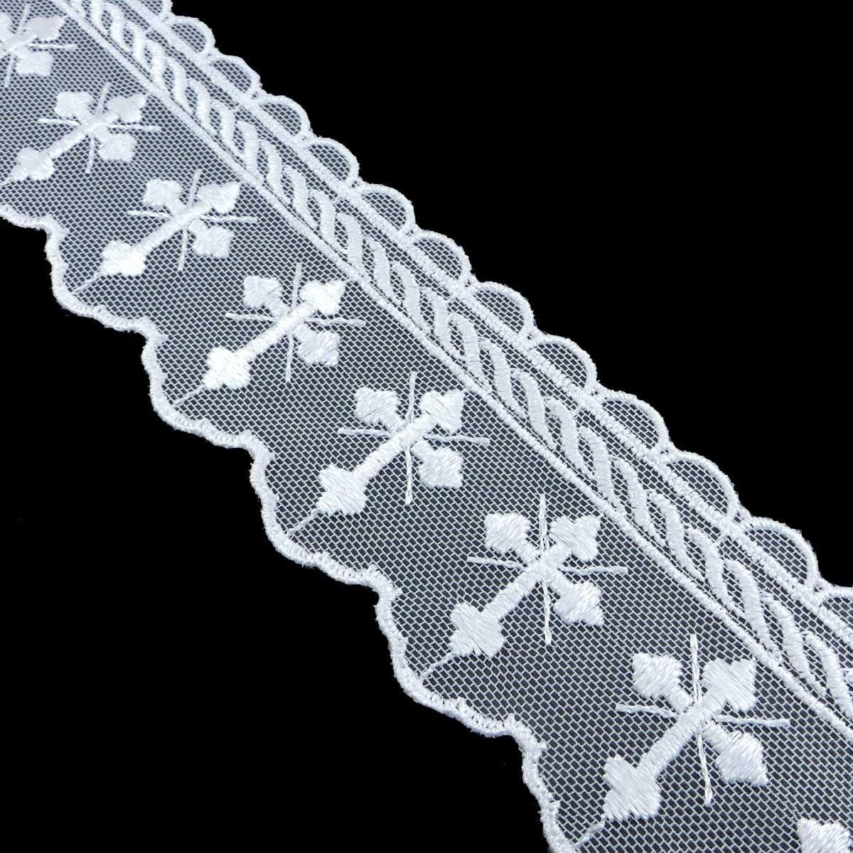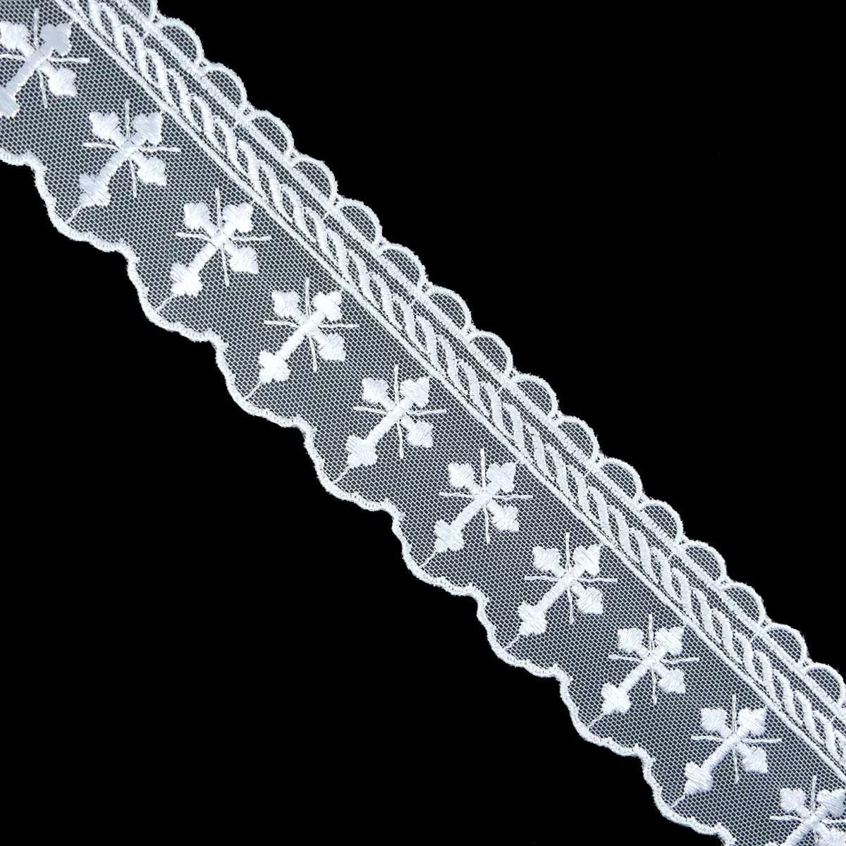 Puntilla de tul bordado en blanco y diseño religioso con cruz cristiana. Posee un ligero brillo debido al rayón, lo que le confiere un aspecto elegante junto a libiano gracias al fondo de tul. De ancho total 5cm.