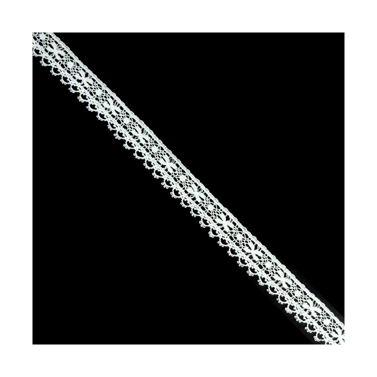 Puntilla de valencienne de 1,5cm de ancho en color blanco y realizado 100% en algodón con flores y acabado en picos.