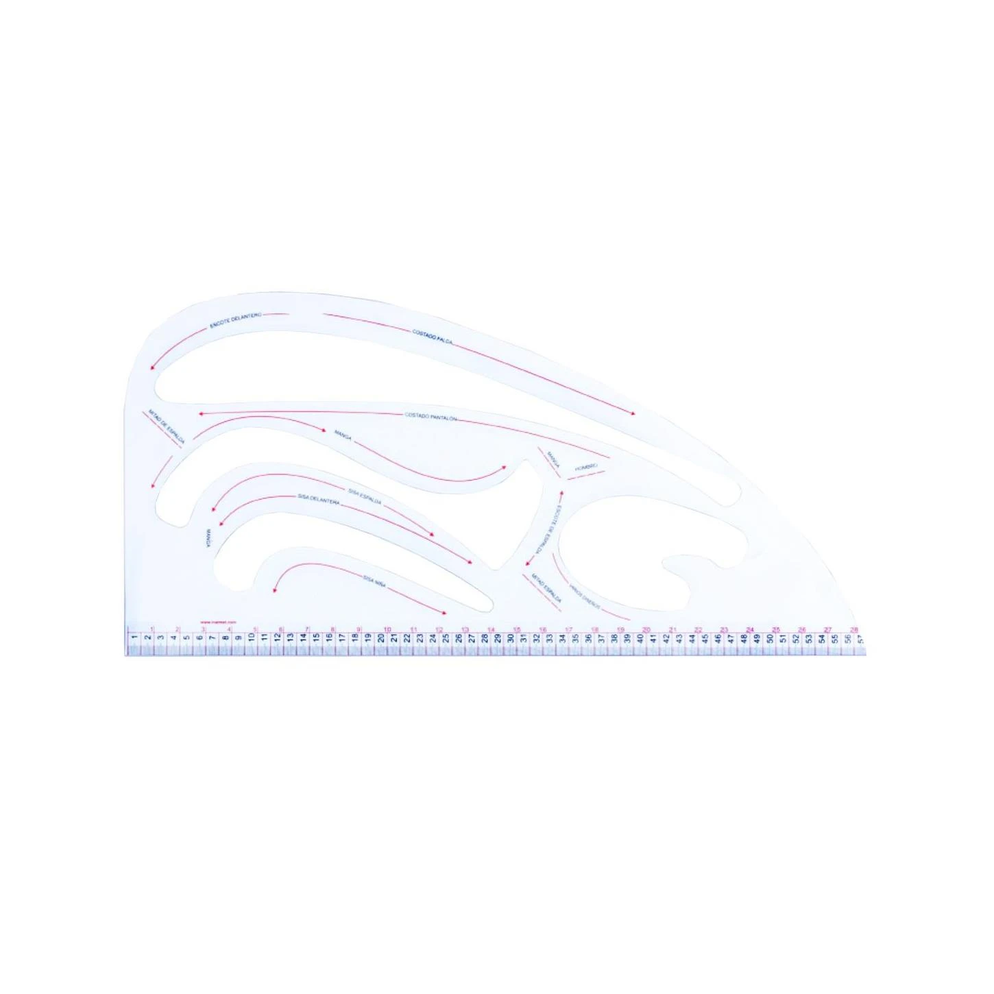 Regla de diseño rígida y transparente, con 57cm de largo y plantillas de corte modelo de indicaciones en rojo como costado pantalón, costado falda, sisa delantera, sisa niña, etc.