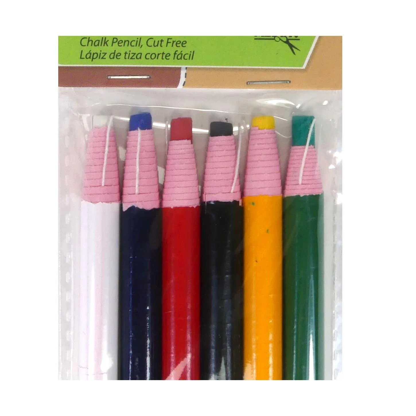 Conjunto de seis lápices de colores gruesos para marcar tela de material tiza y con hilo especial para sacar punta sin necesidad de afilar.