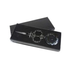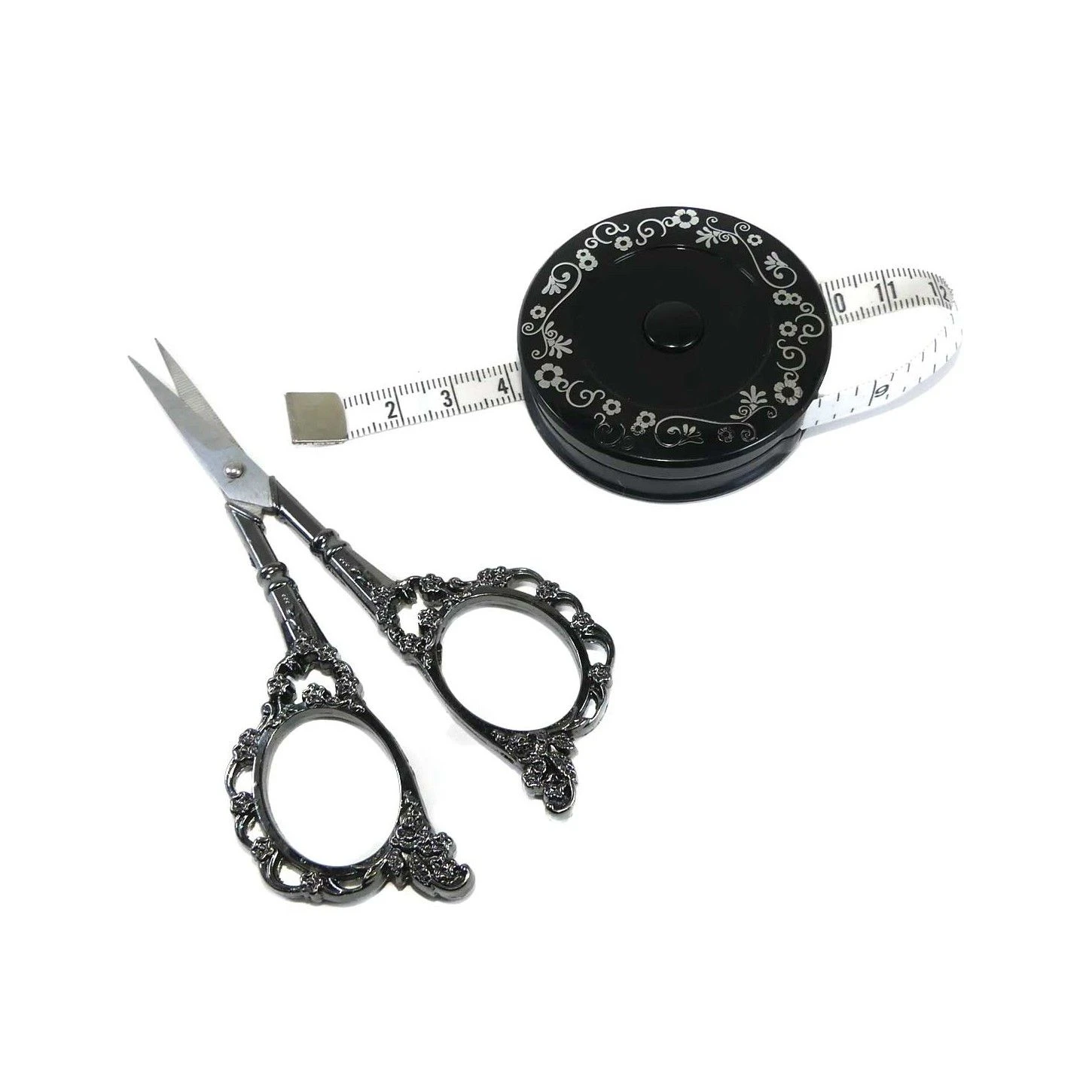 Piezas realizadas en color metalizado negro. Preciosas tijeras de 11cm de longitud y un original metro magnético de 1,5cm con medidas en centímetros y pulgadas.