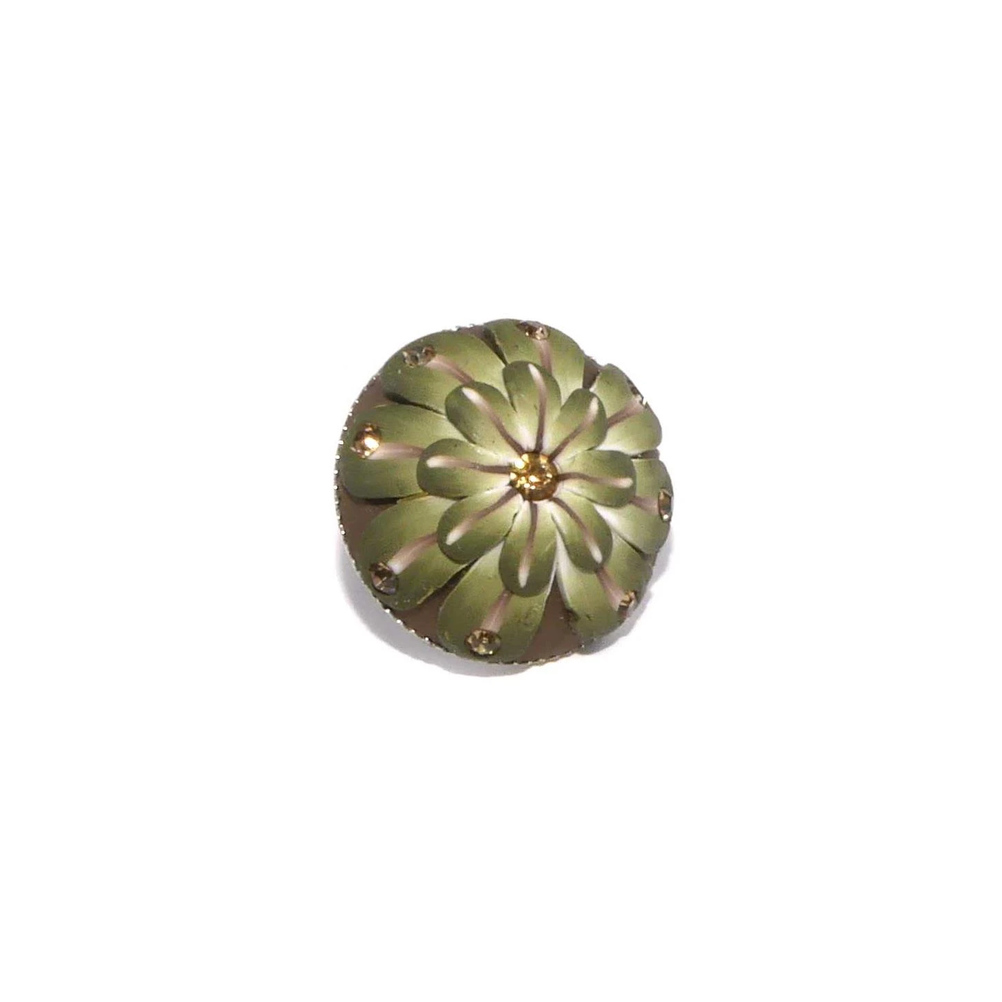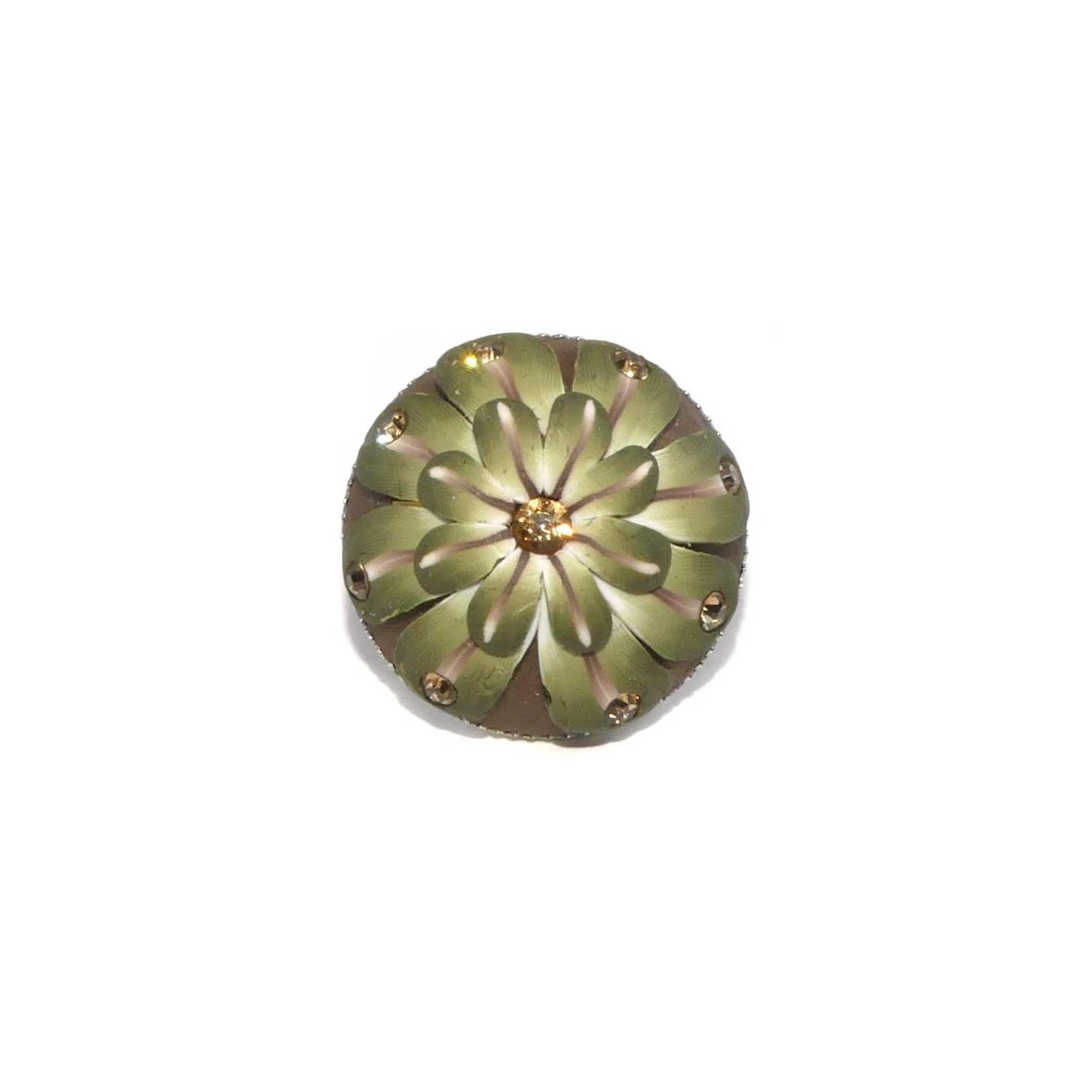 Tachuela o tacha con forma redonda y diseño de flor, disponible en verde y gris y de 2,5cm de diámetro con 8mm de alto (sin contar las patas). Seleccionar el color deseado a continuación.