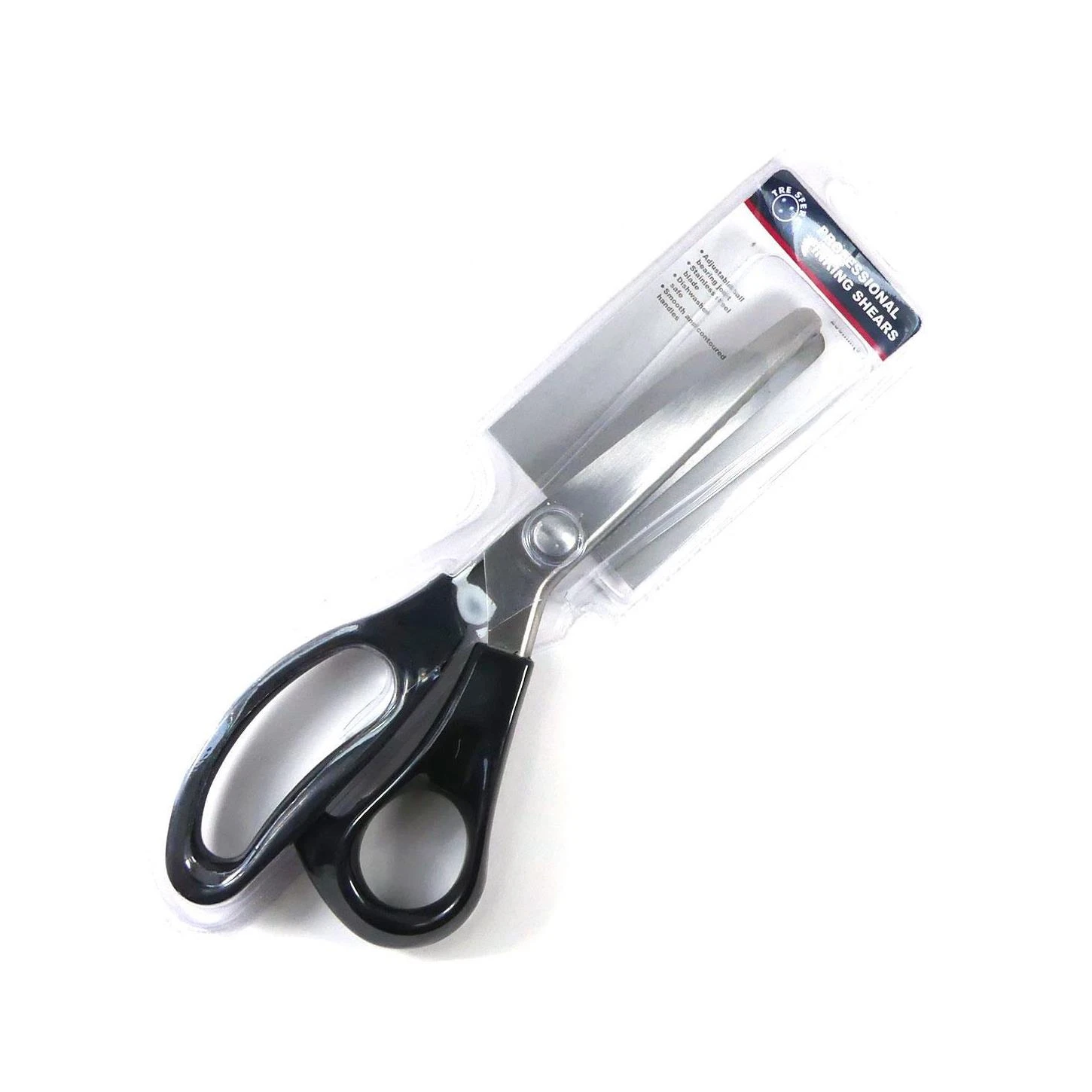Tijera de acero inoxidable dentada en forma de zig zag o de picos, de 23,2cm de longitud con mango plástico negro muy adaptable a la forma de la mano.