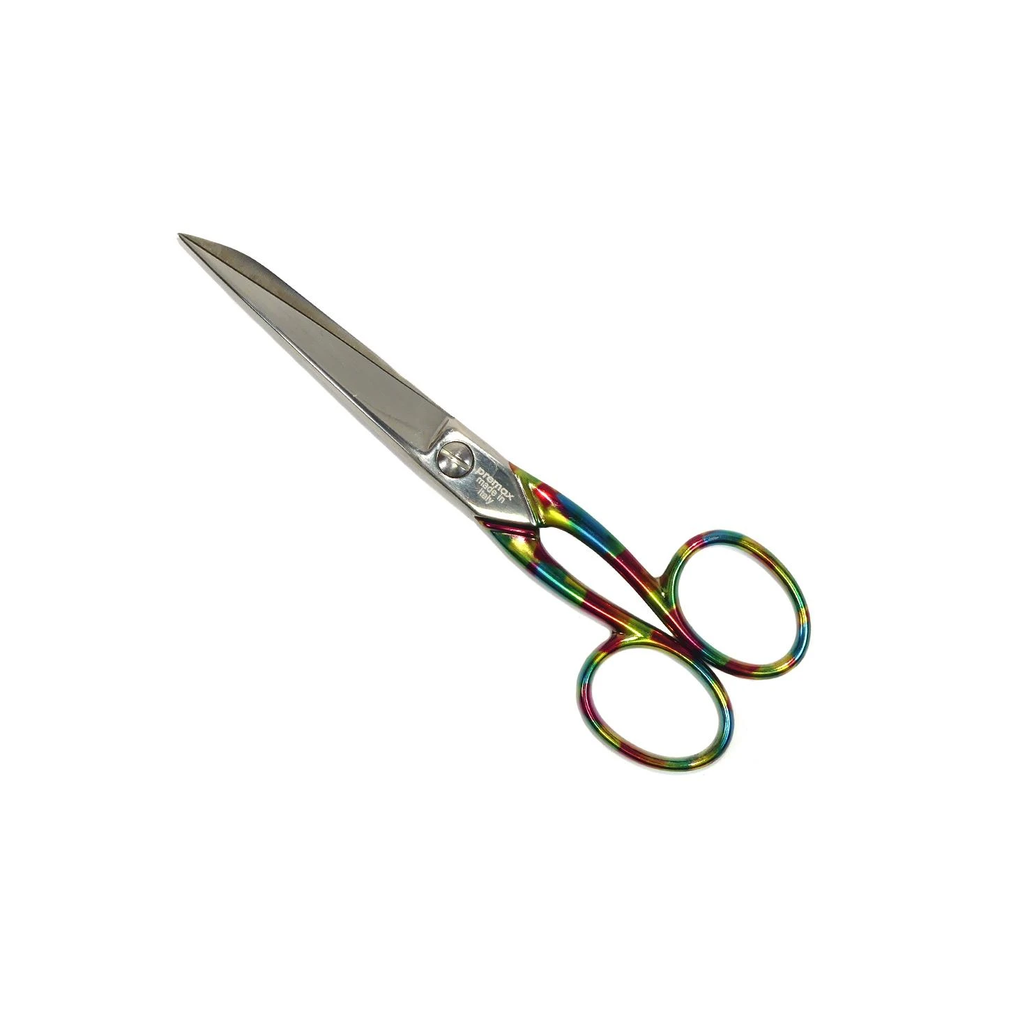 Tijera de acero de 15cm de largo y con mango en los colores de la aurora boreal. Marca Premax.