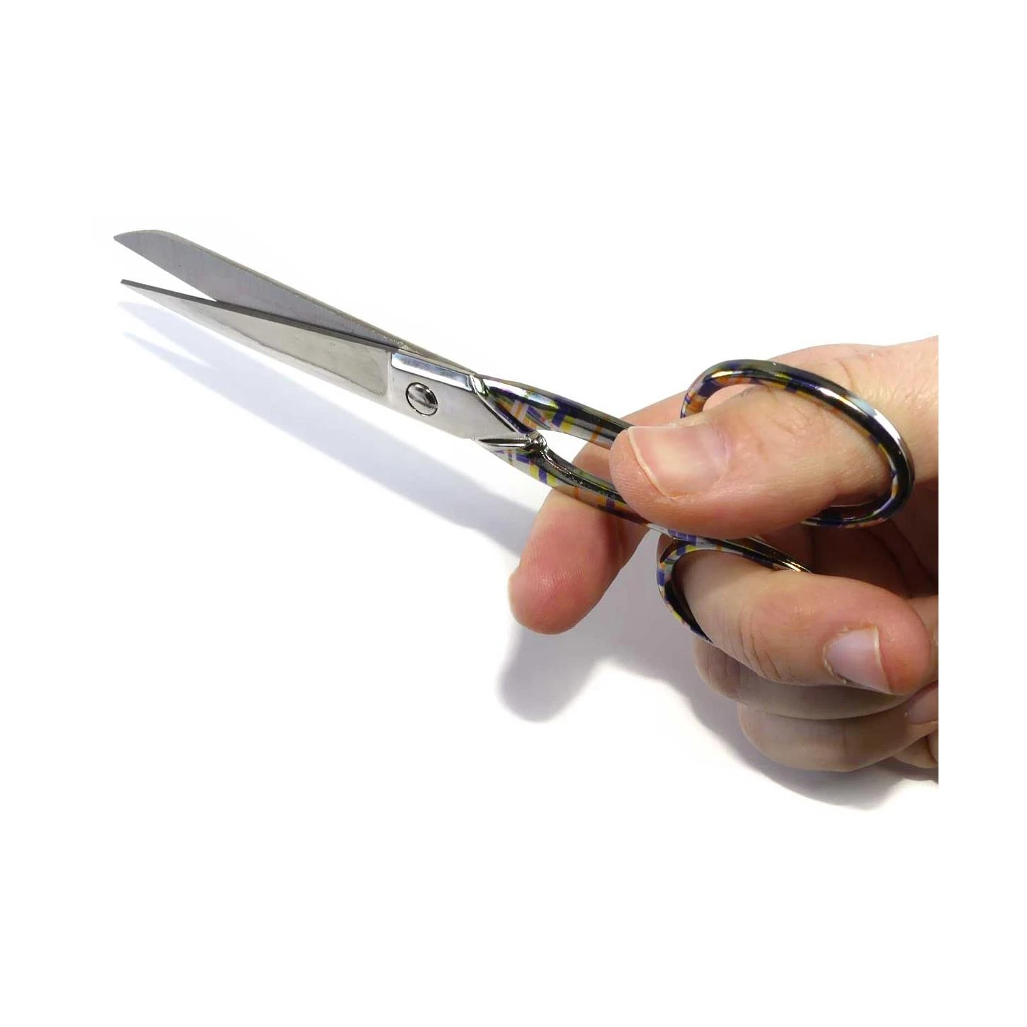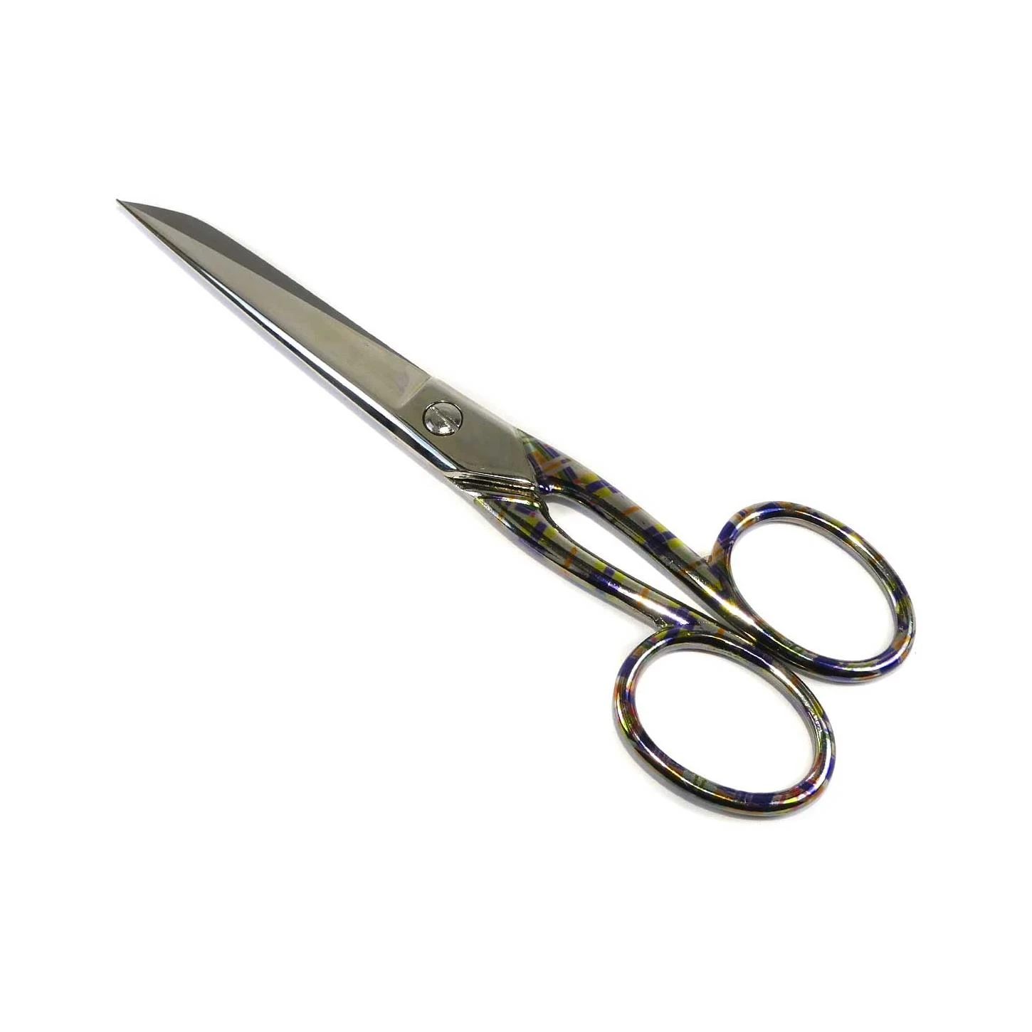 Tijera de acero con mango estampado a cuadros multicolor y de 15cm de longitud. De la marca Premax.