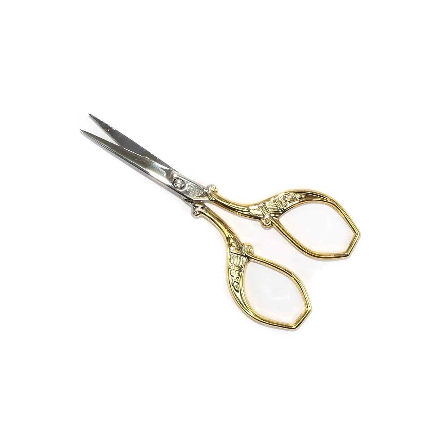 Tijera con diseño clásico decorativo en dorado, de acero inoxidable.